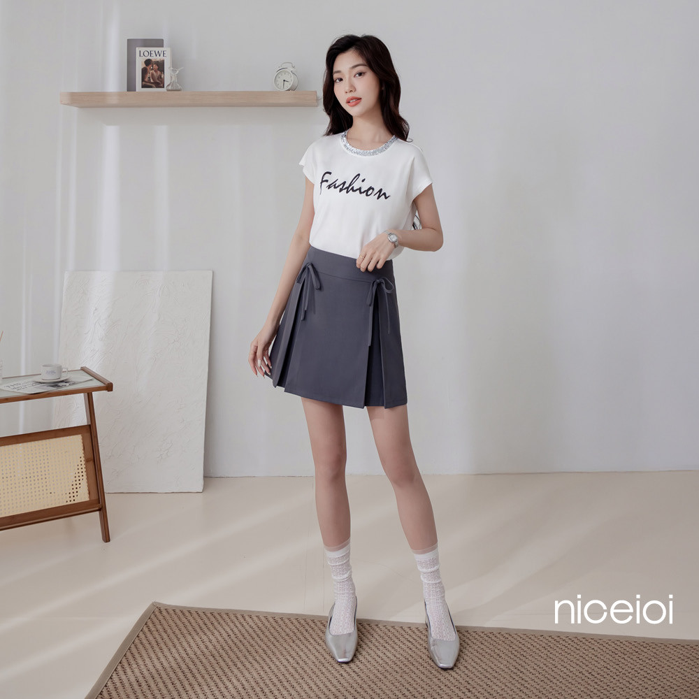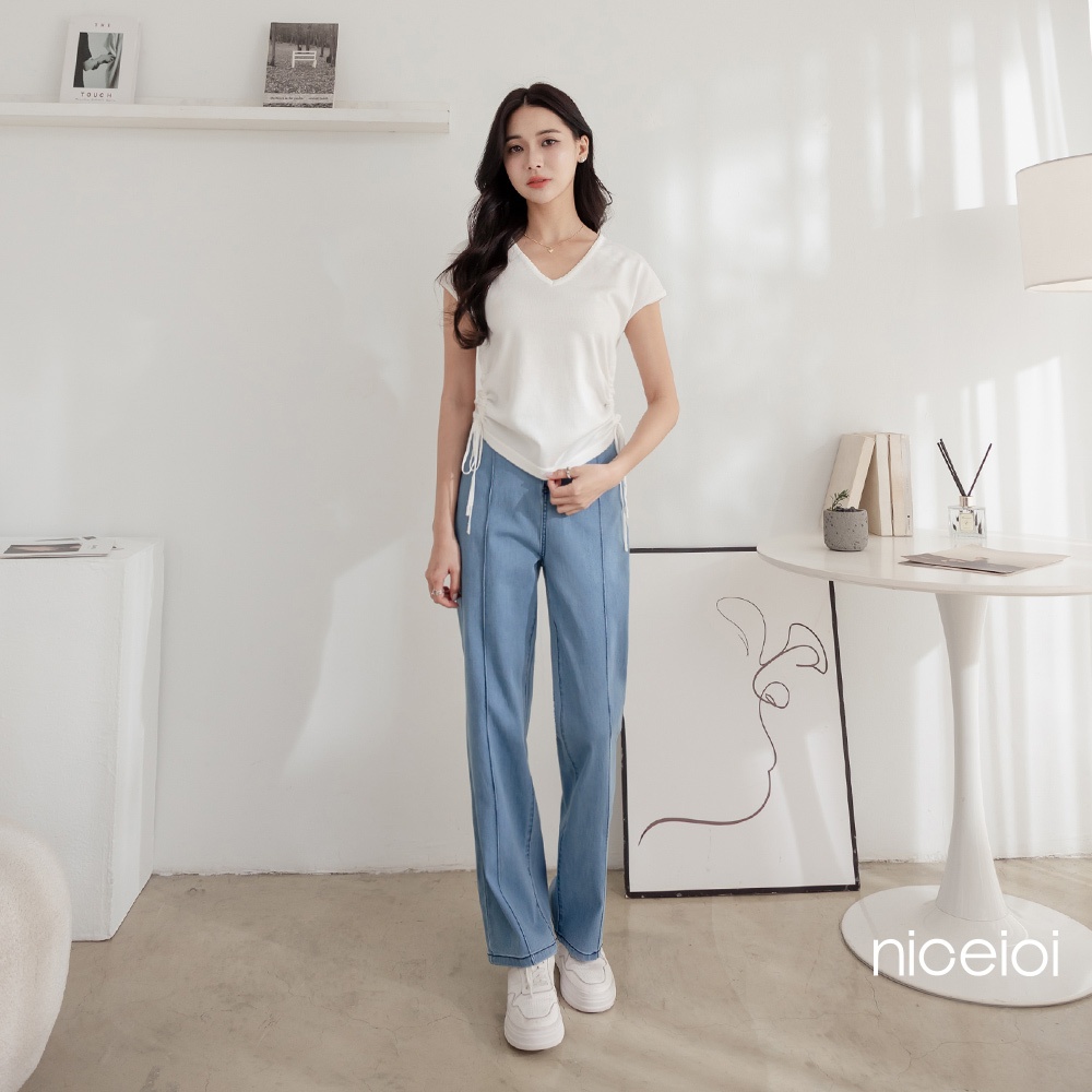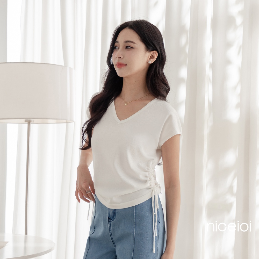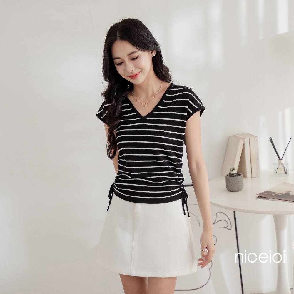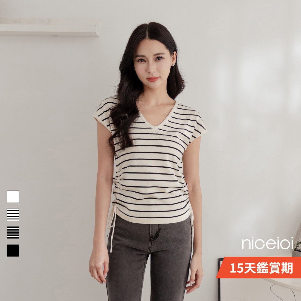 niceioi 針織上衣 短袖 無袖 白色 [清新側抓皺綁帶V領蓋袖針織上衣] 女裝針織上衣-白,F|針織上衣-黑,F|針織上衣-米條紋,F|針織上衣-黑條紋,FT-shirtsniceioi 官方旗艦店