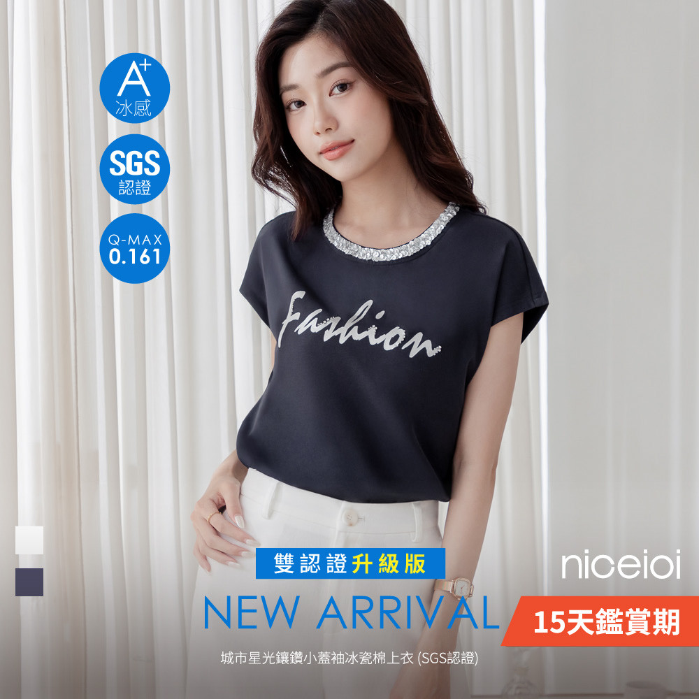 niceioi 涼感上衣 短袖 亮片上衣 深藍色 [城市星光鑲鑽小蓋袖冰瓷棉上衣] (SGS認證) 涼感t恤 女裝涼感上衣-白,M|涼感上衣-白,L|涼感上衣-白,XL|涼感上衣-白,S|涼感上衣-深藍,M|涼感上衣-深藍,L|涼感上衣-深藍,XL|涼感上衣-深藍,ST-shirtsniceioi 官方旗艦店