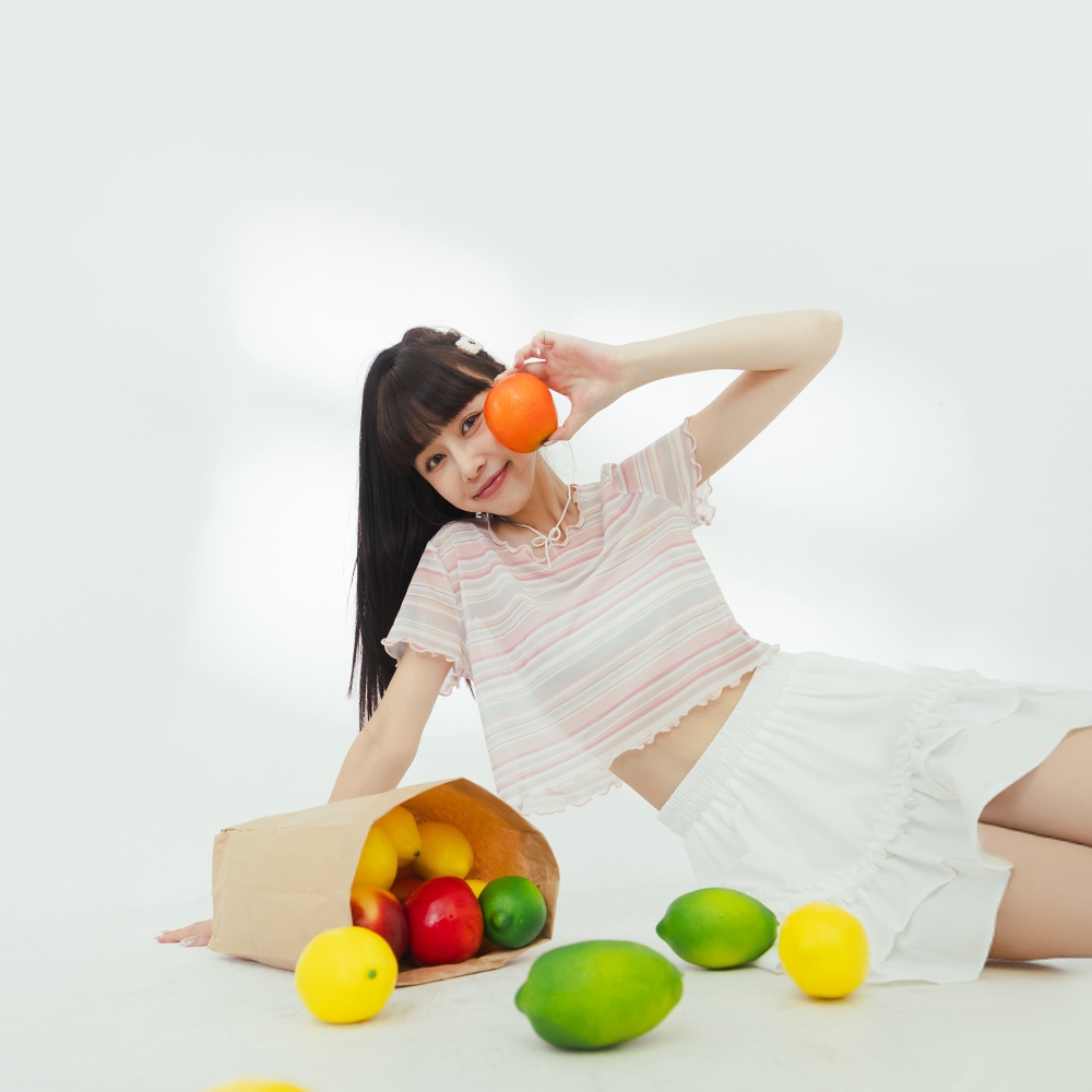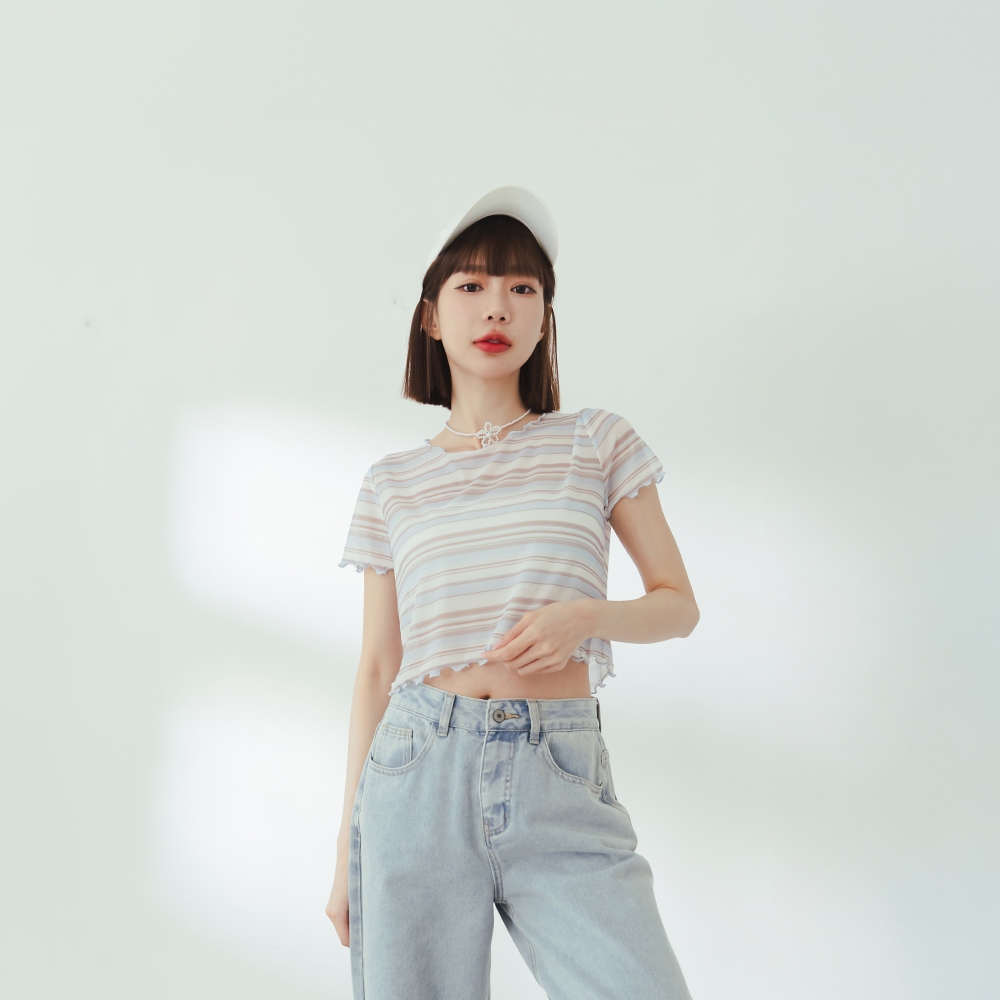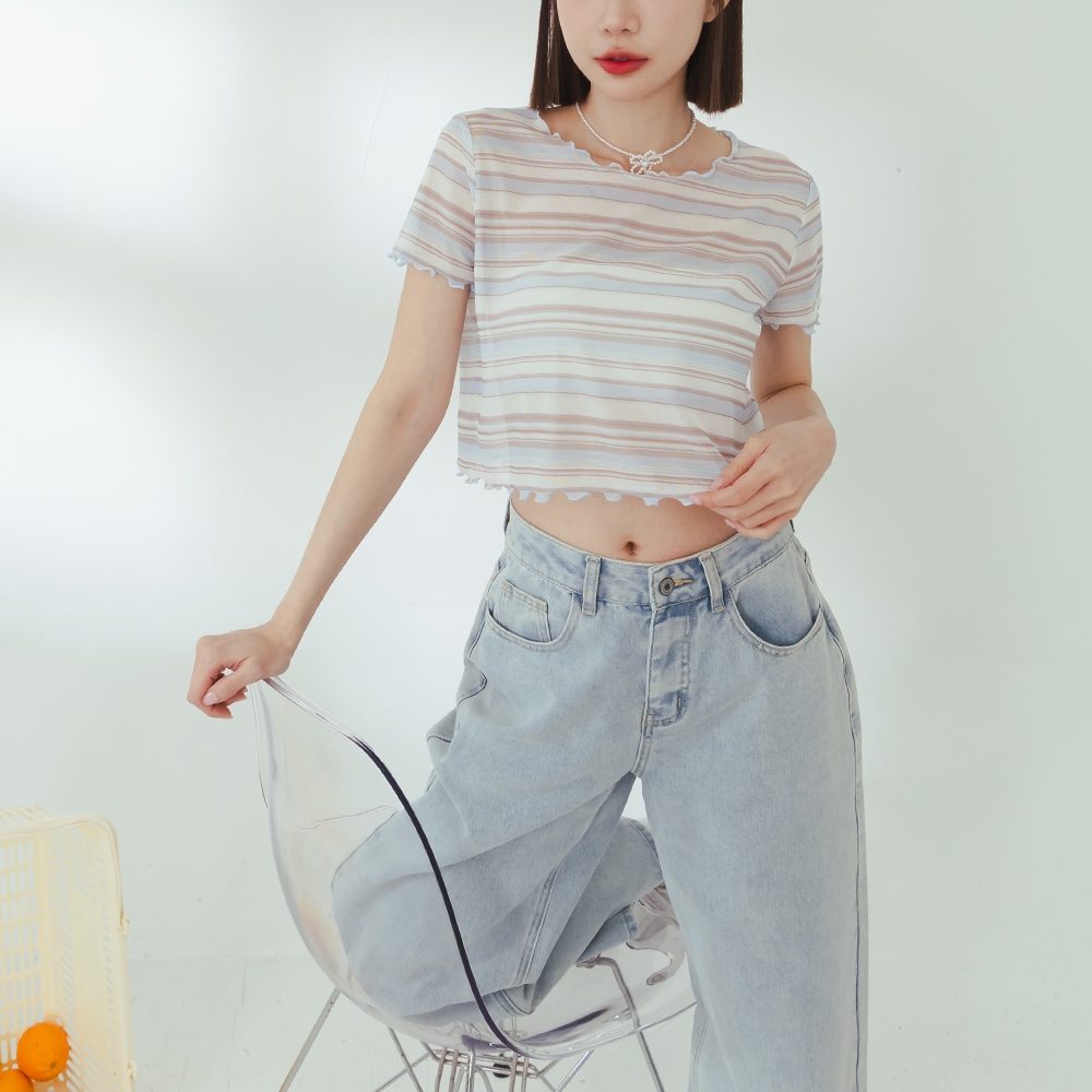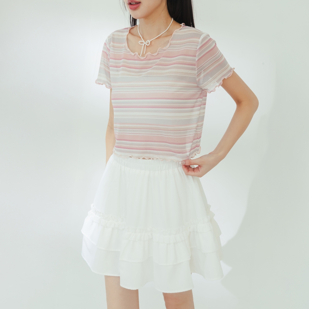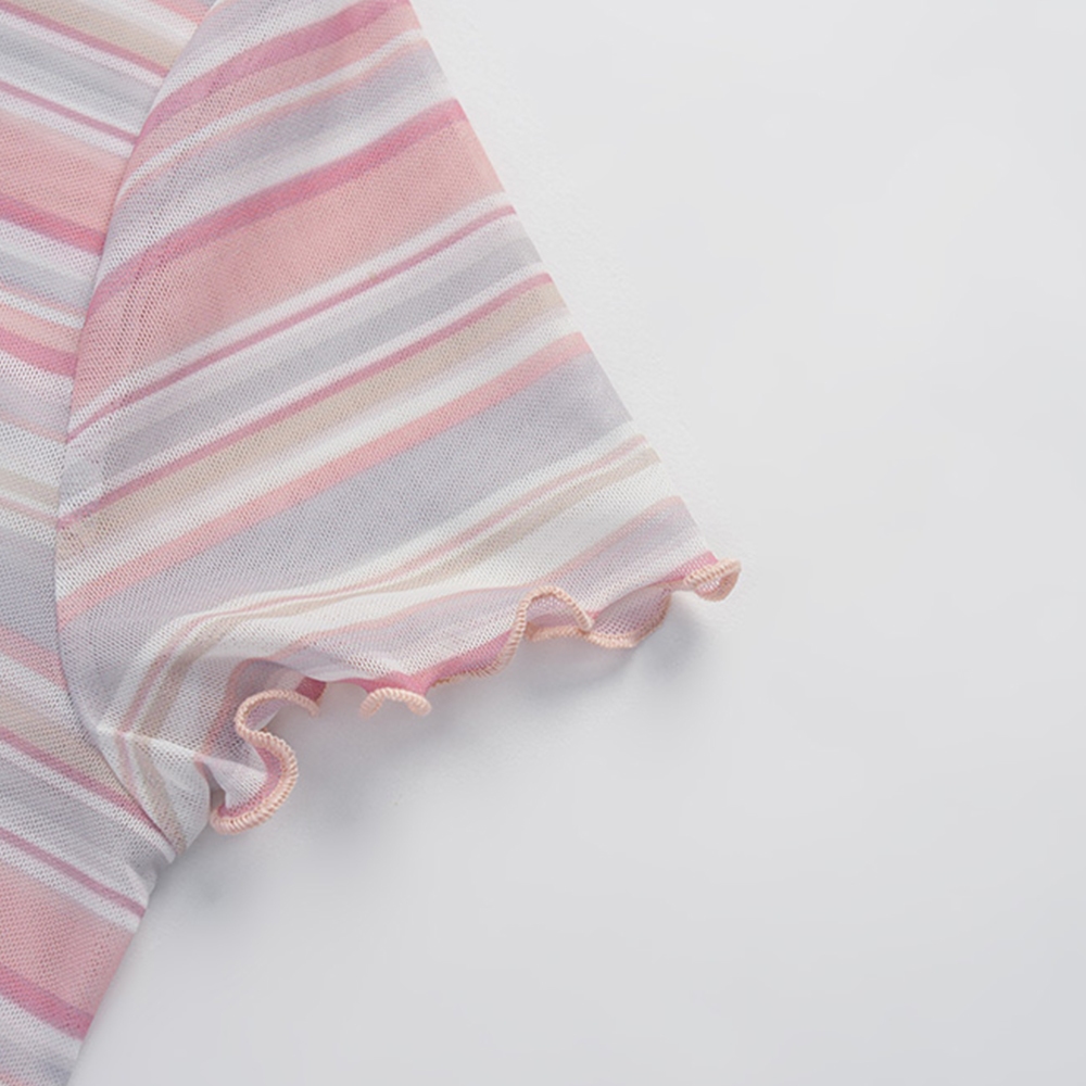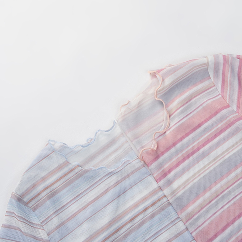 QUEENSHOP_ S 女裝 短袖撞色條紋網紗木耳邊透膚上衣 兩色售 現+預 【01099078】粉|藍OthersQUEENSHOP