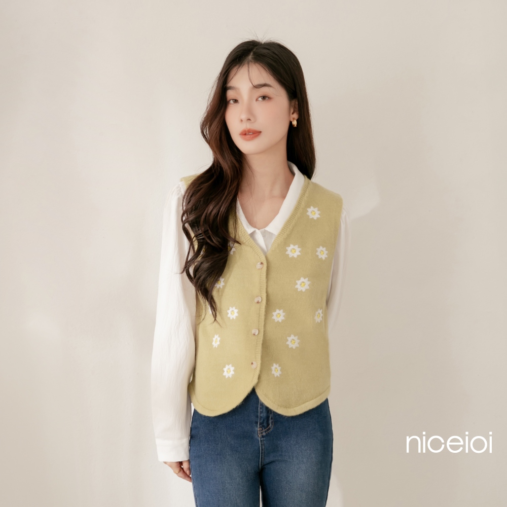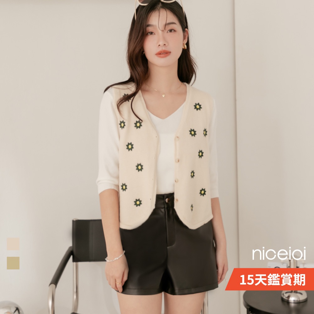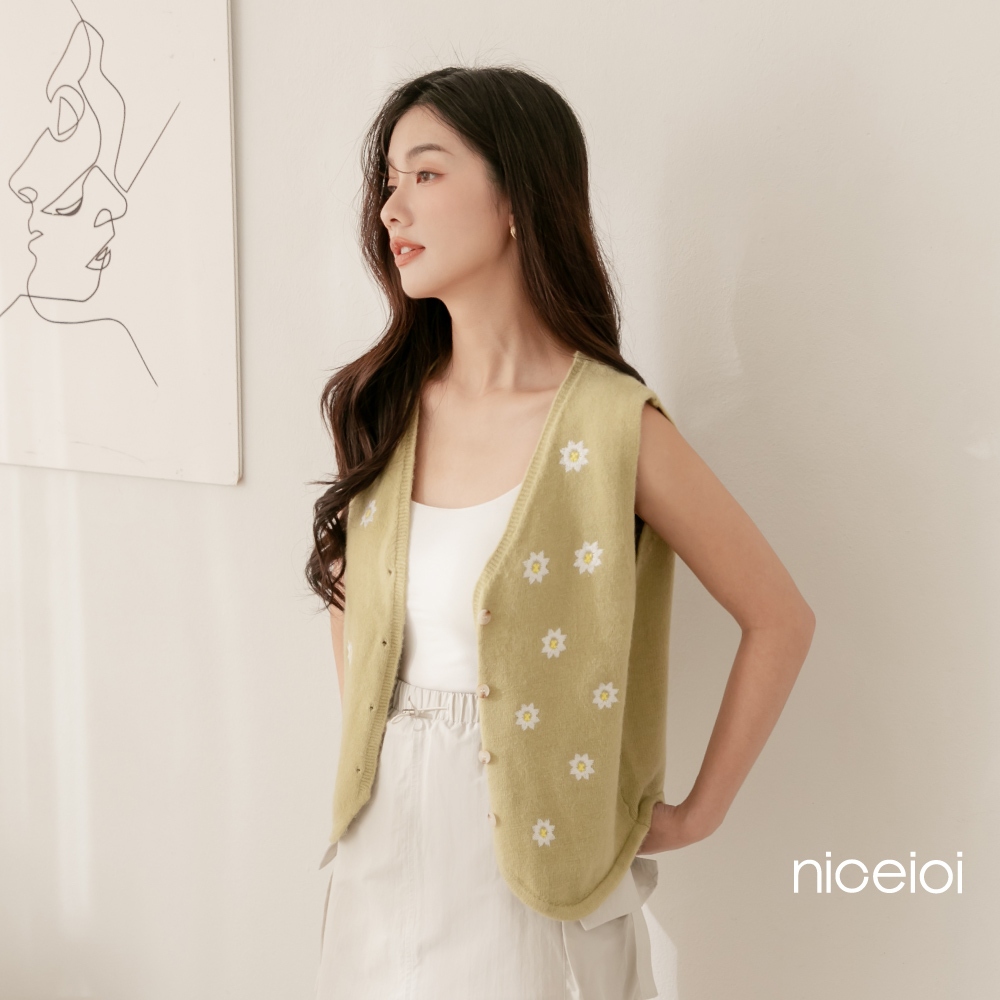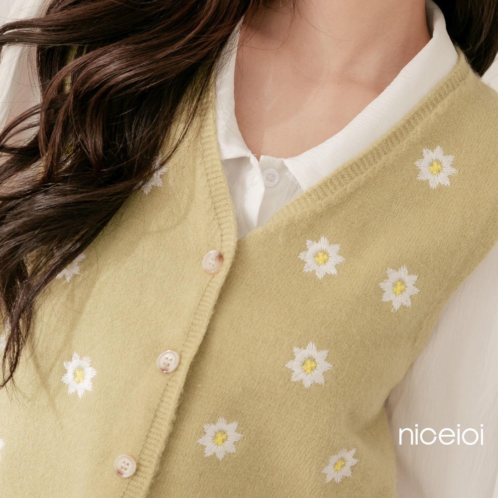 niceioi【特惠】針織背心 無袖背心 刺繡背心 綠色 [活潑撞色刺繡毛茉莉針織背心] 女裝無袖針織背心 米色,F|無袖針織背心 綠色,Fniceioi 官方旗艦店