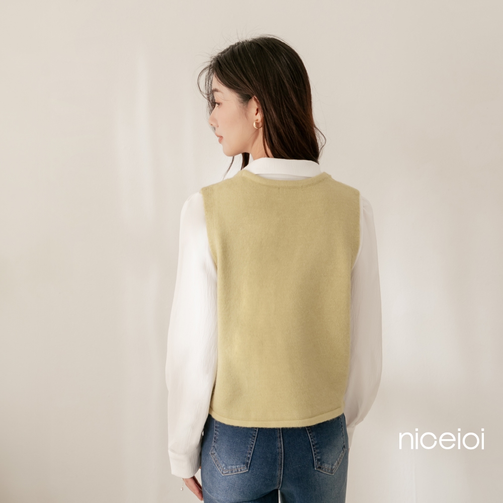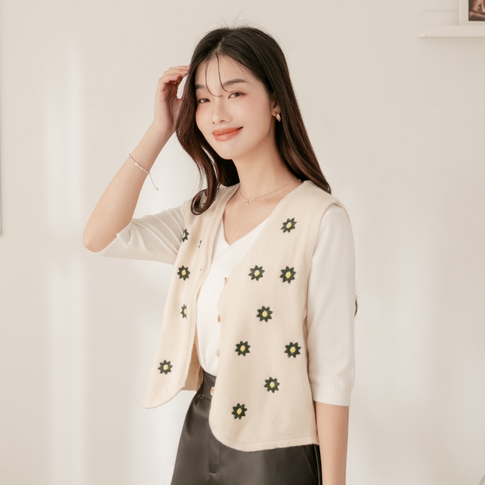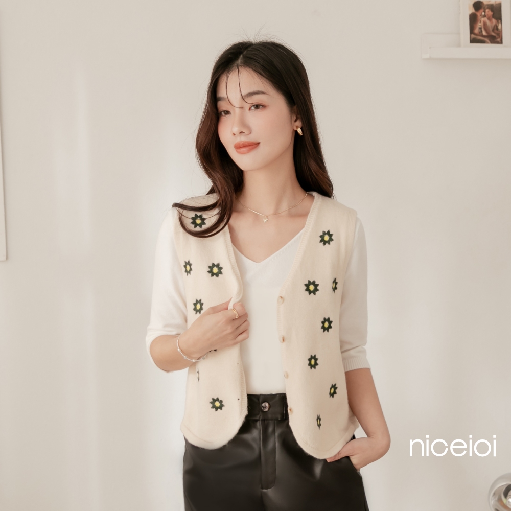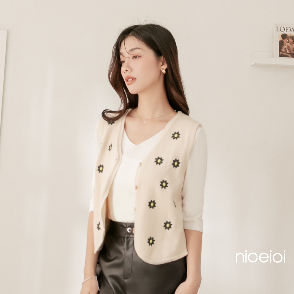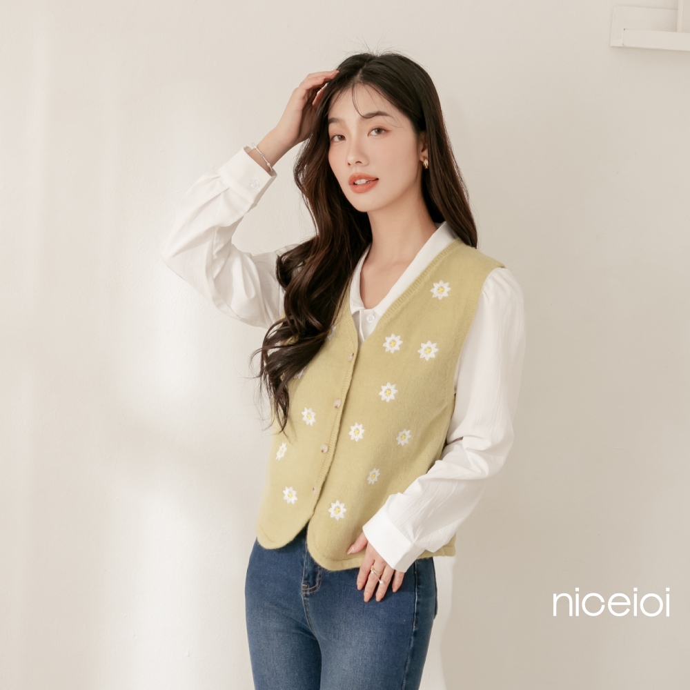 niceioi【特惠】針織背心 無袖背心 刺繡背心 綠色 [活潑撞色刺繡毛茉莉針織背心] 女裝無袖針織背心 米色,F|無袖針織背心 綠色,Fniceioi 官方旗艦店