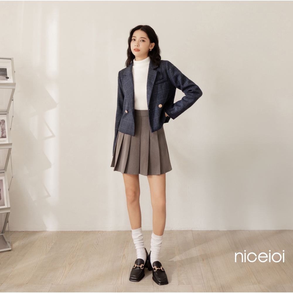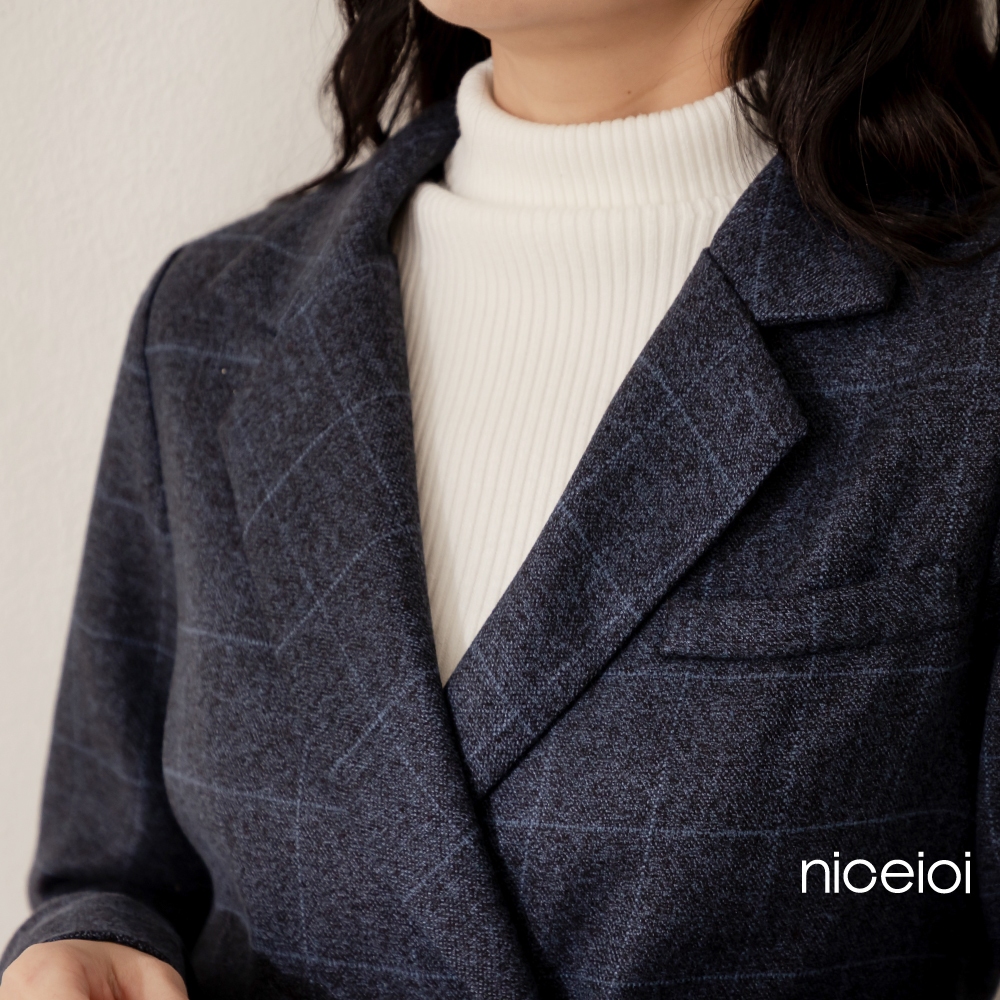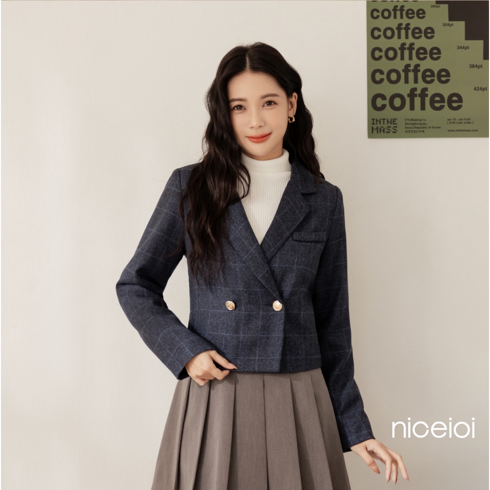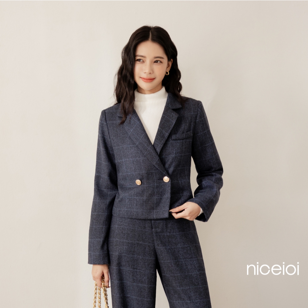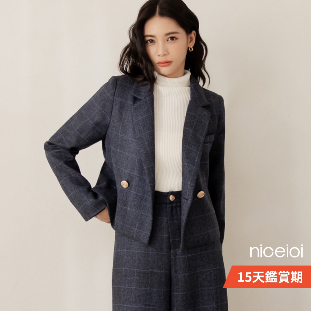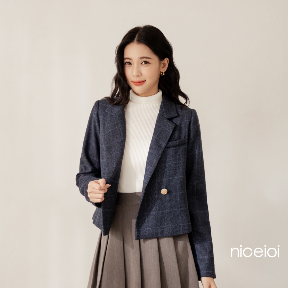 niceioi【特惠】女生西裝外套 西裝 毛呢外套 藍色 [高級提案深藍格紋短版西裝外套] 女裝