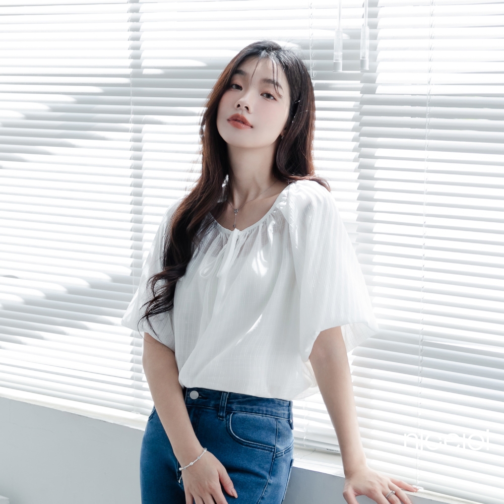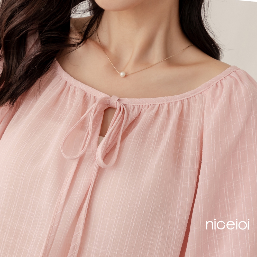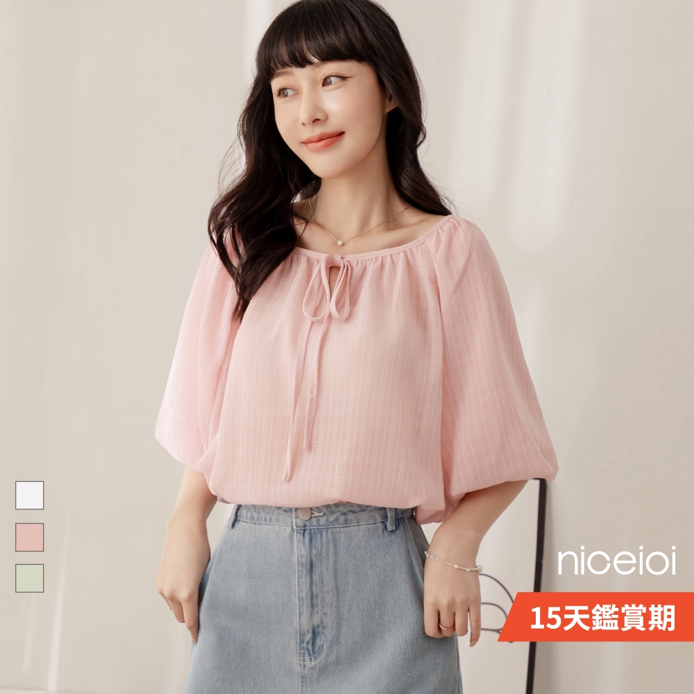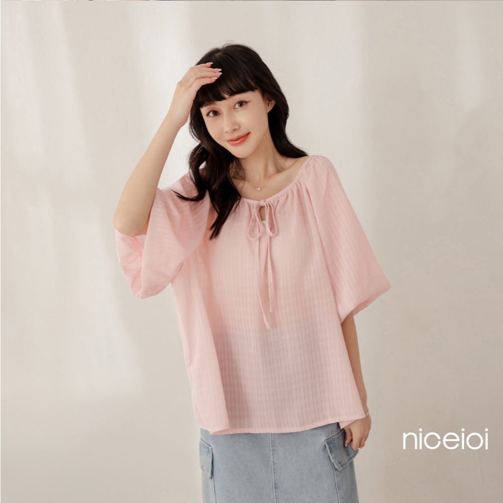 niceioi【特惠】靚麗綁帶格紋緹花上衣 (共3色) 女裝白,F|粉,F|藍綠,FT-shirtsniceioi 官方旗艦店