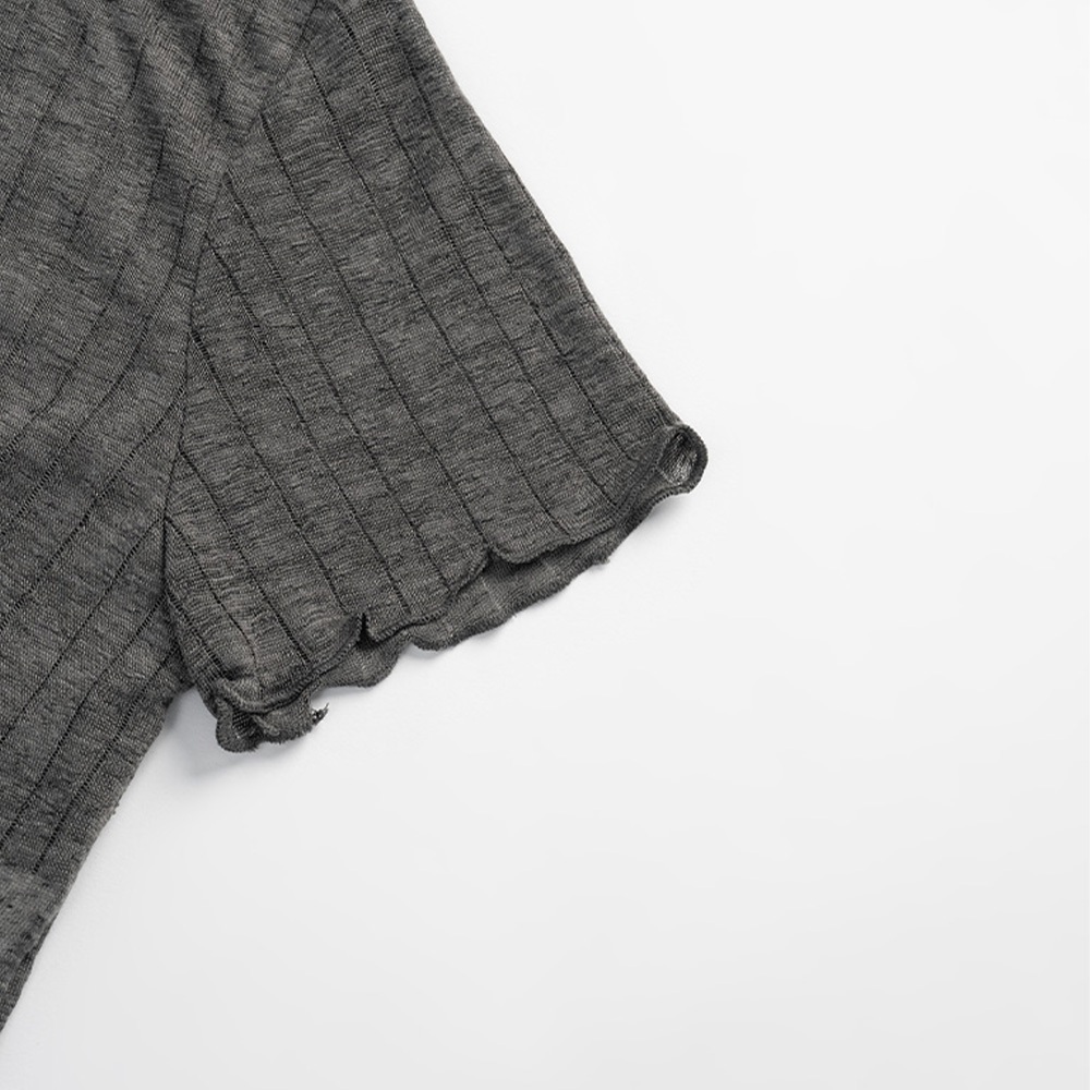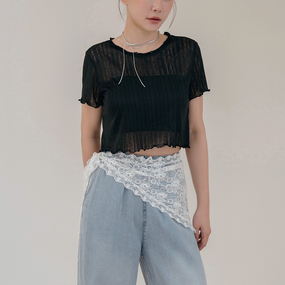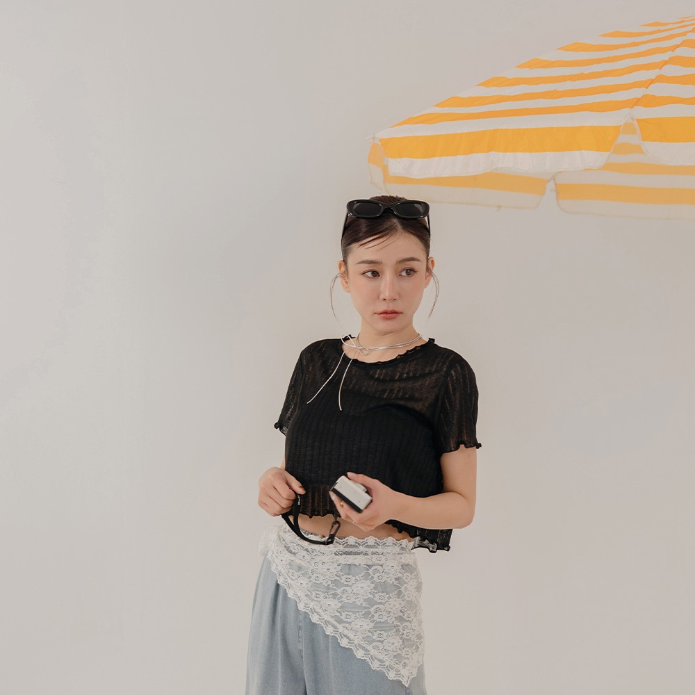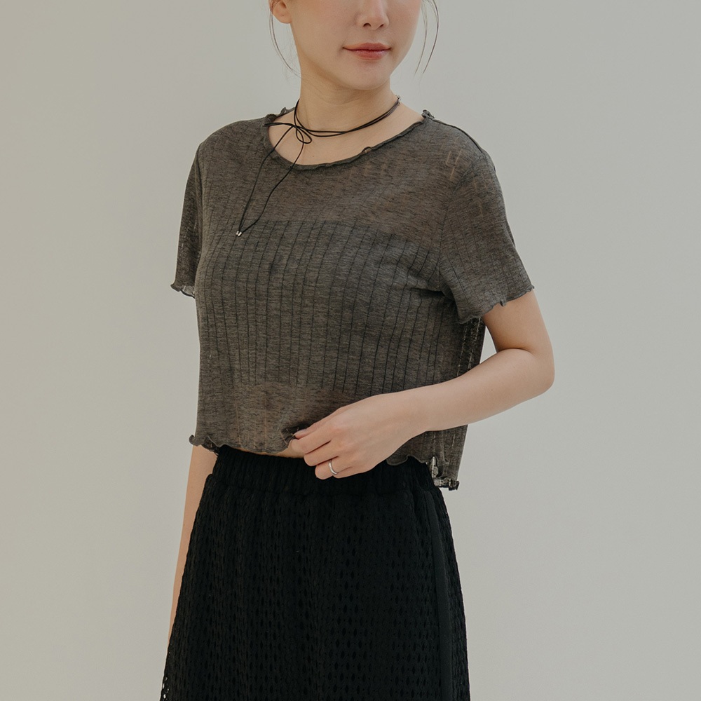 QUEENSHOP_ S 女裝 木耳邊直紋透膚短袖上衣 三色售 現+預 【01098778】黑|灰|白T-shirtsQUEENSHOP