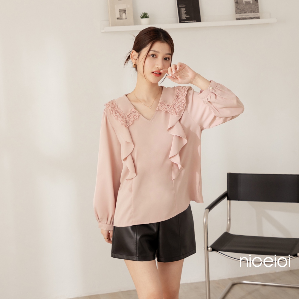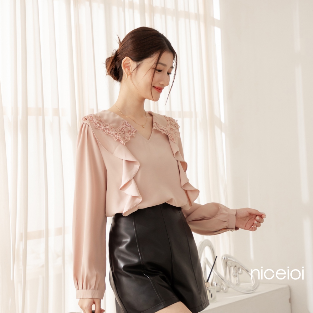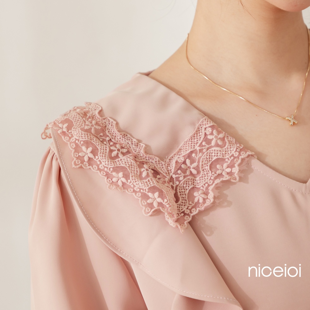 niceioi【特惠】花邊少女蕾絲領荷葉上衣 (共2色) 女裝白,F|粉,FShirts & Blousesniceioi 官方旗艦店
