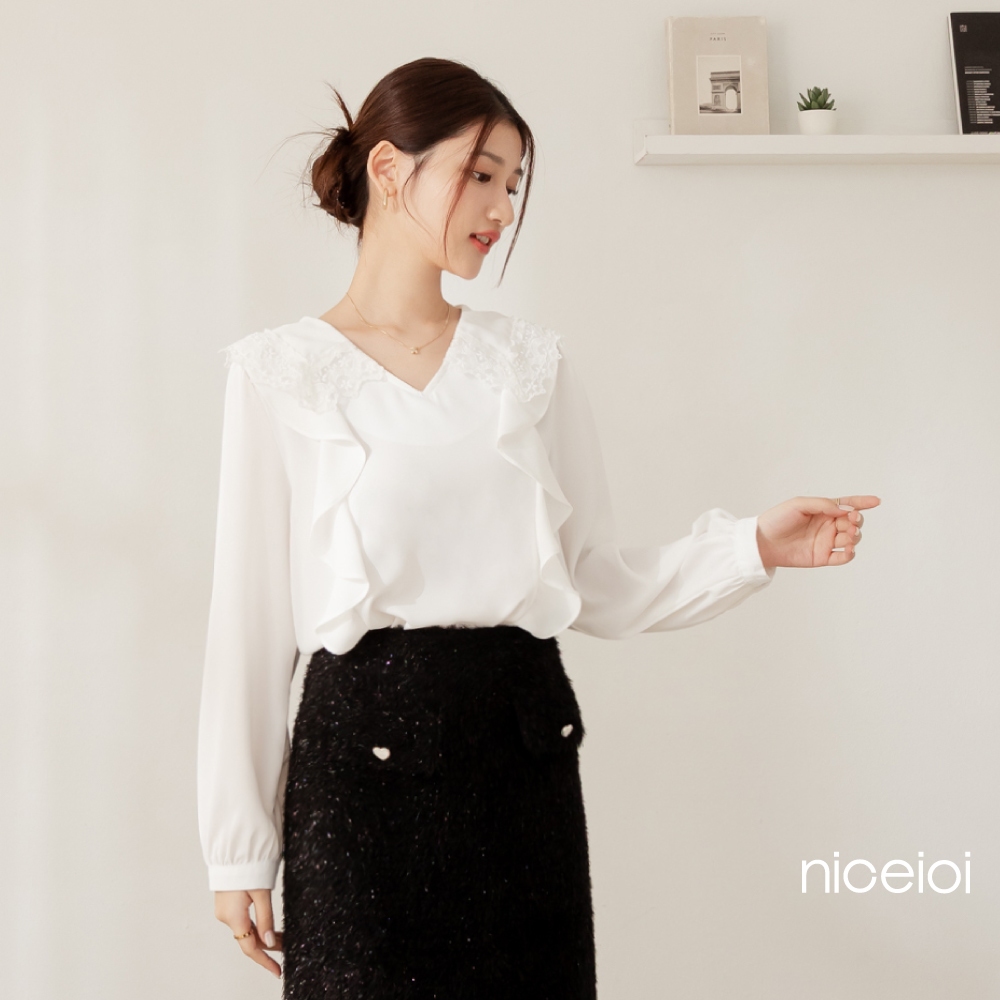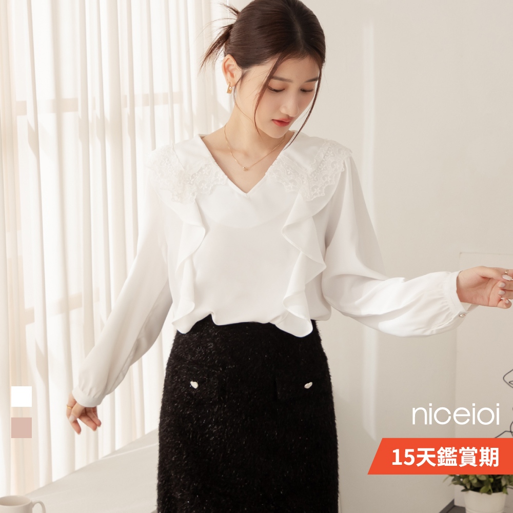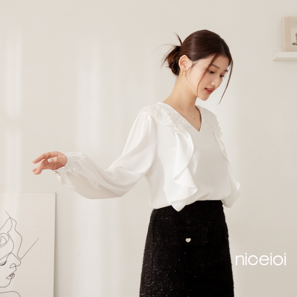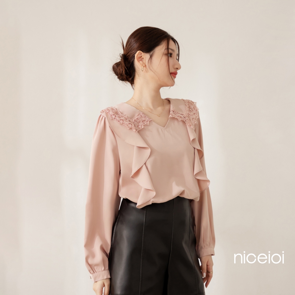 niceioi【特惠】花邊少女蕾絲領荷葉上衣 (共2色) 女裝白,F|粉,FShirts & Blousesniceioi 官方旗艦店