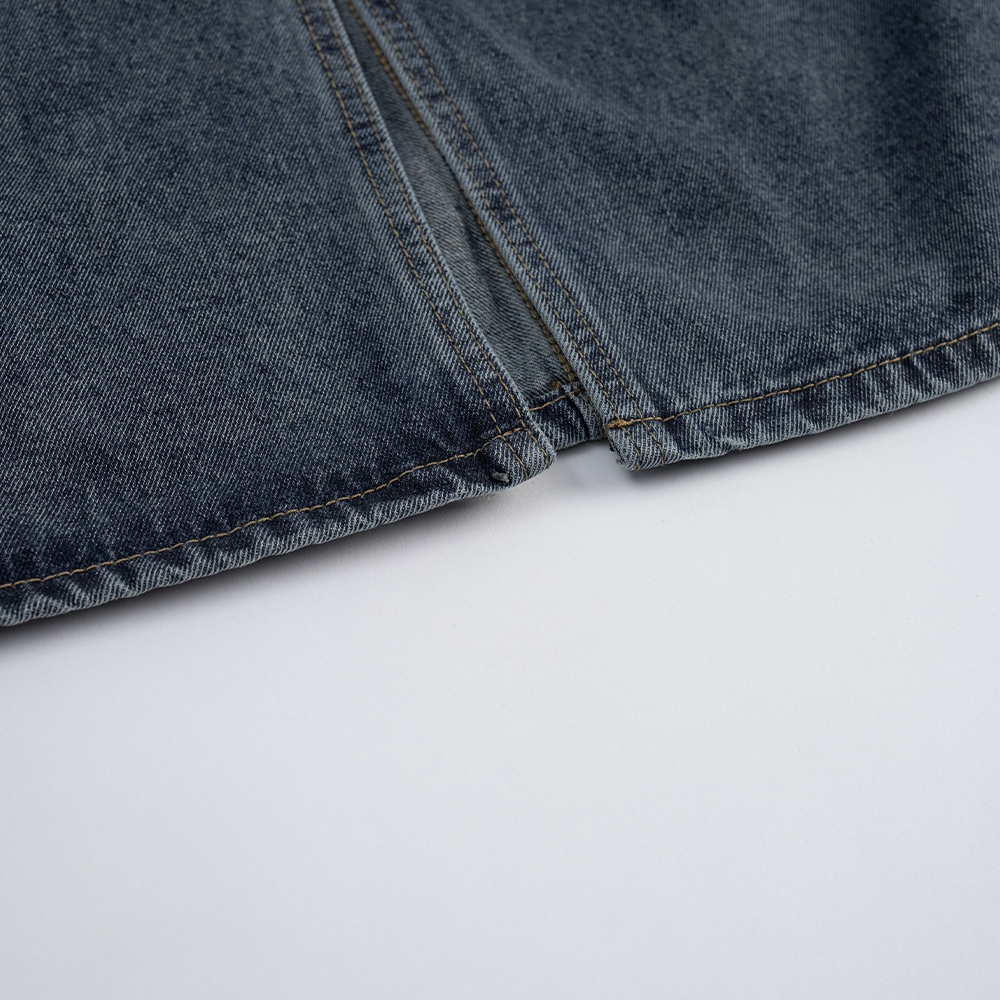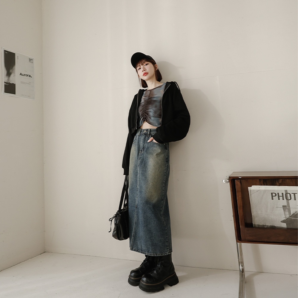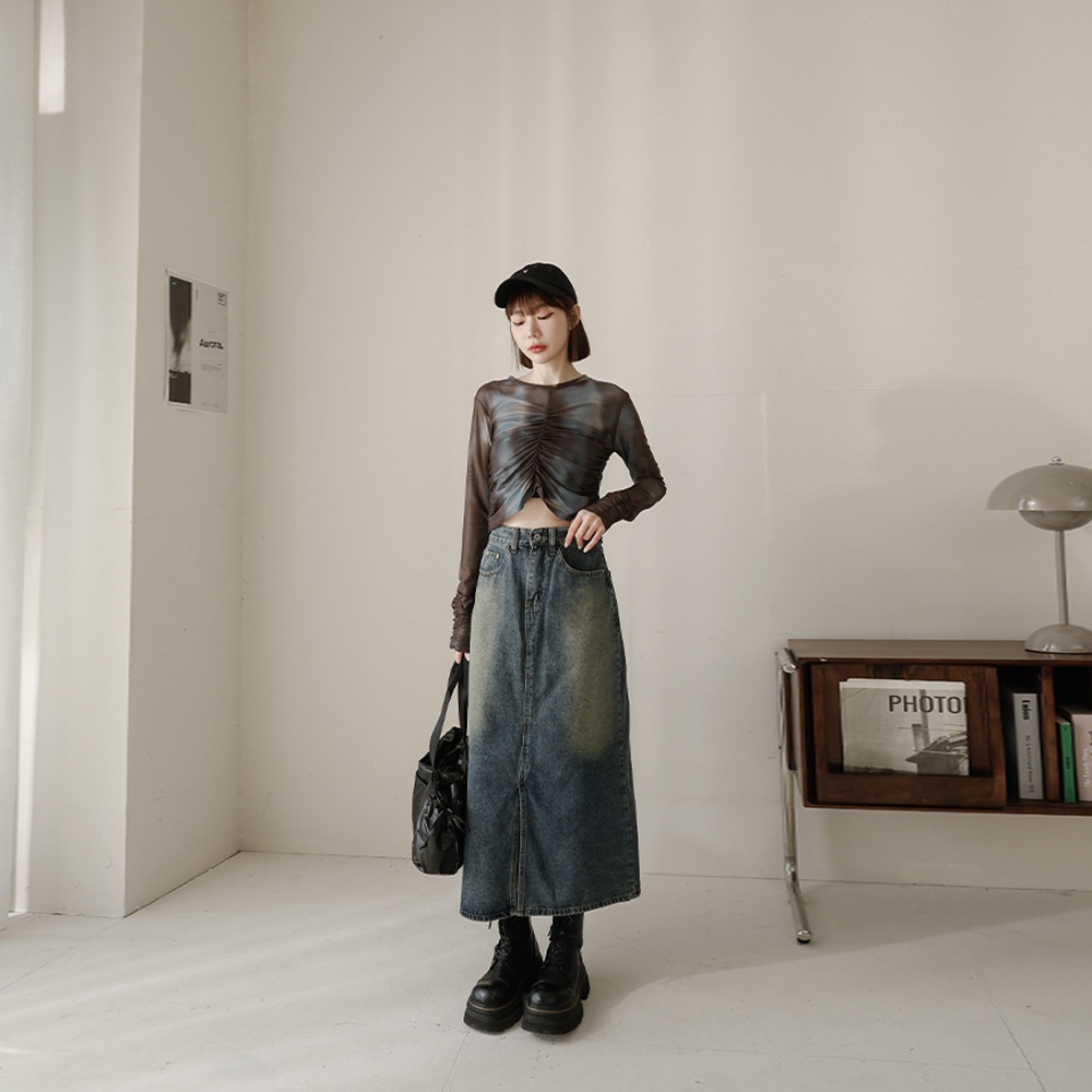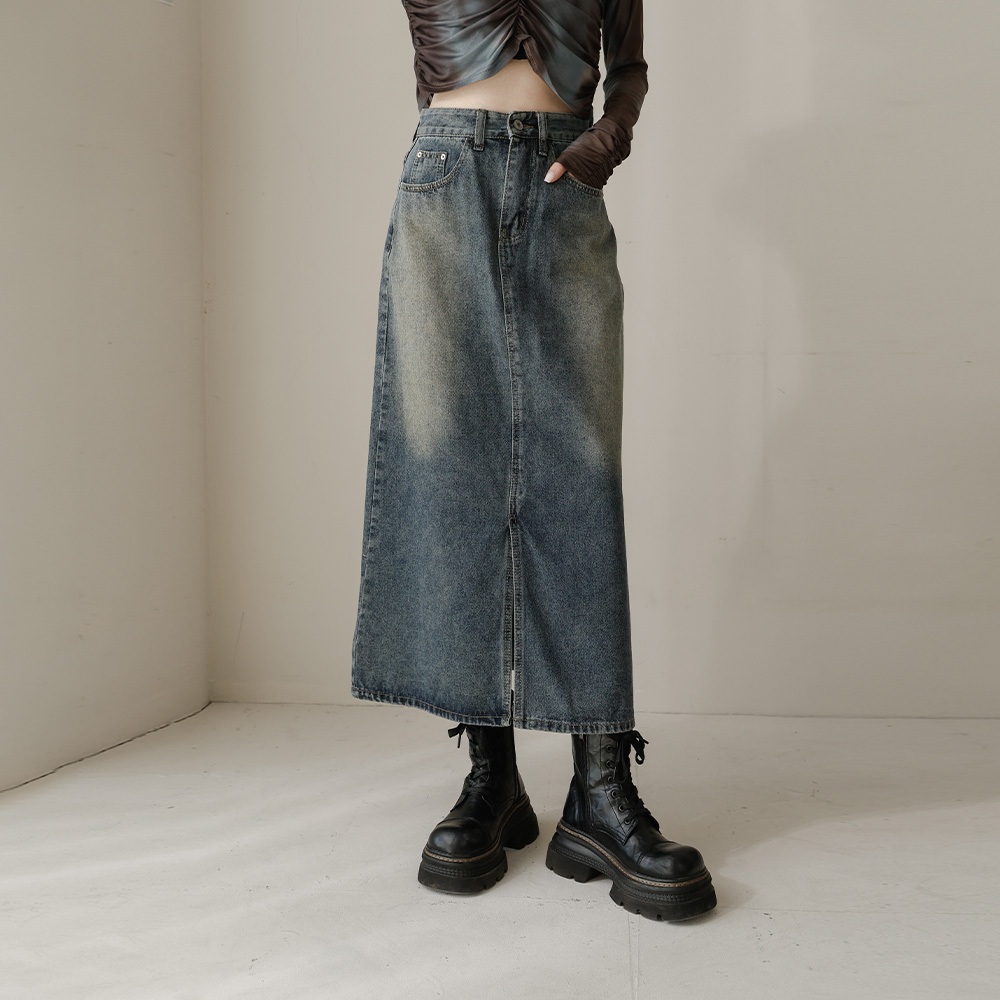 QUEENSHOP_ S 女裝 前中開衩洗舊感牛仔長裙 S/M/L 現+預 【03021474】S|M|LQUEENSHOP