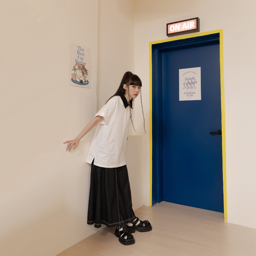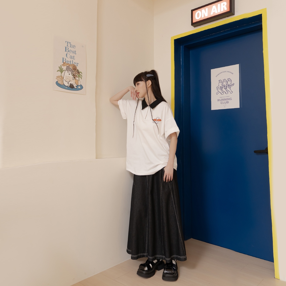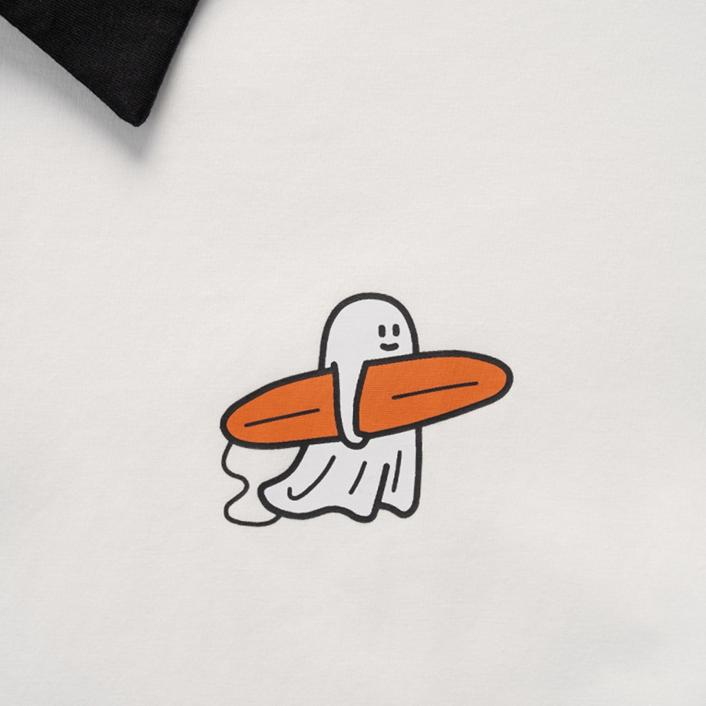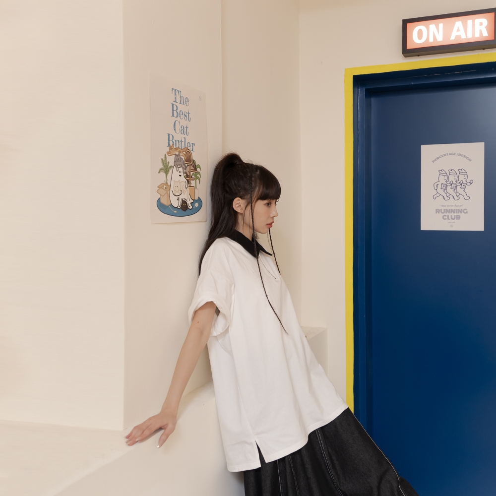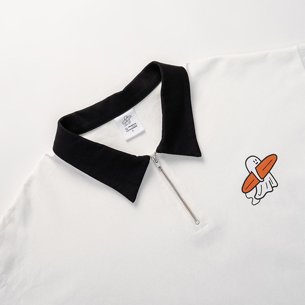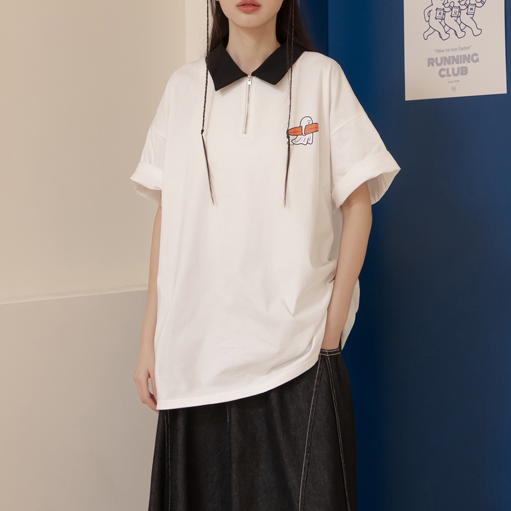 QUEENSHOP_ S 女裝 短袖 P/D幽靈 撞色領片半門襟印圖寬版上衣 現+預 【01060067】依賣場Polo ShirtsQUEENSHOP