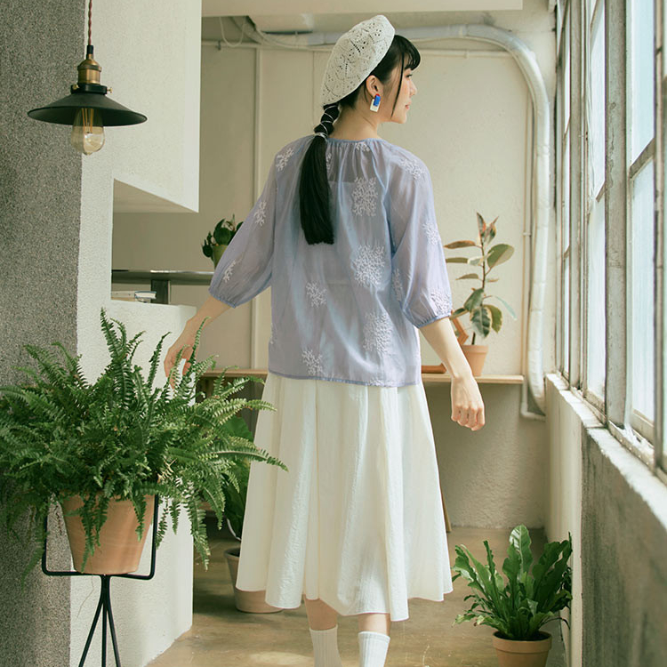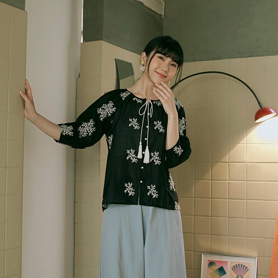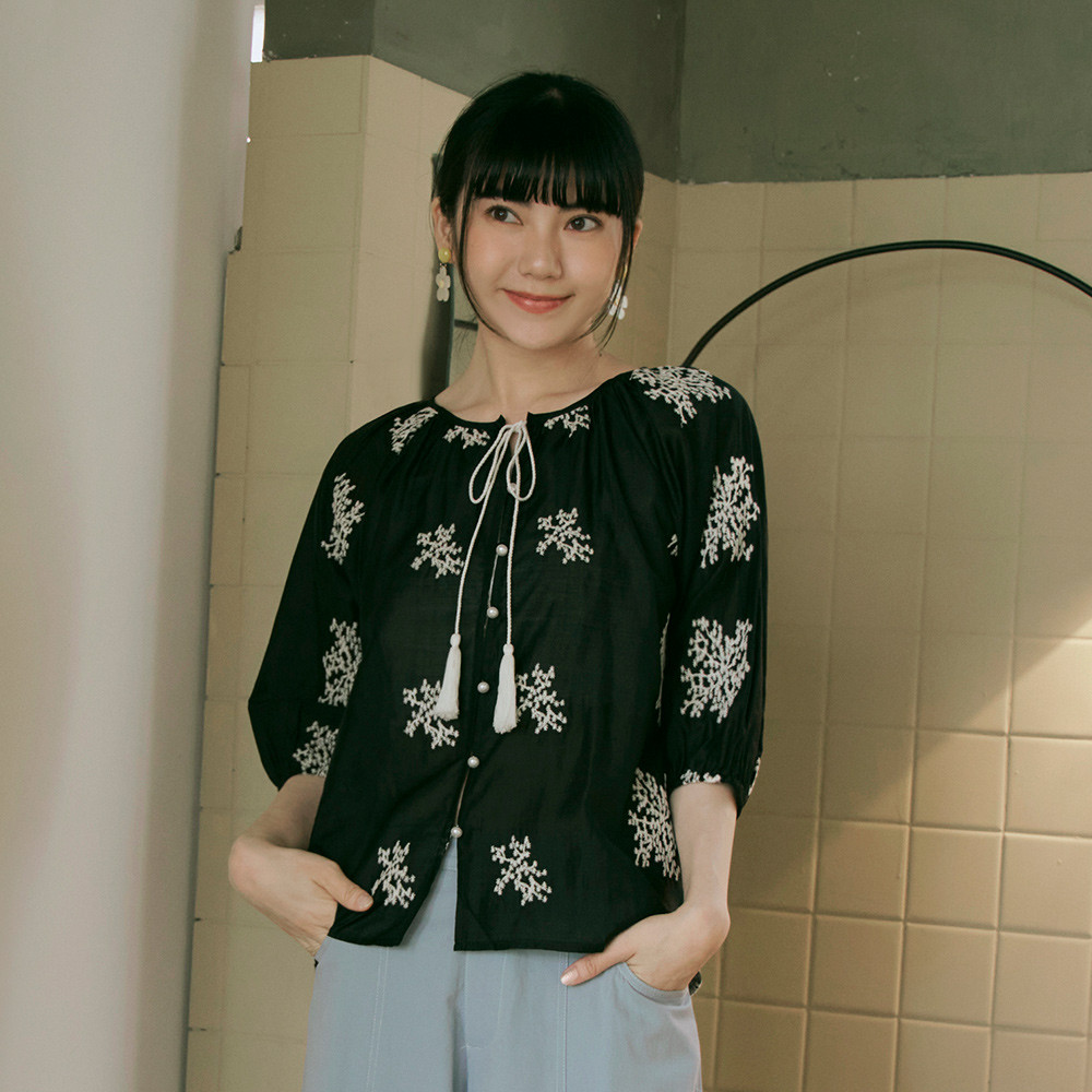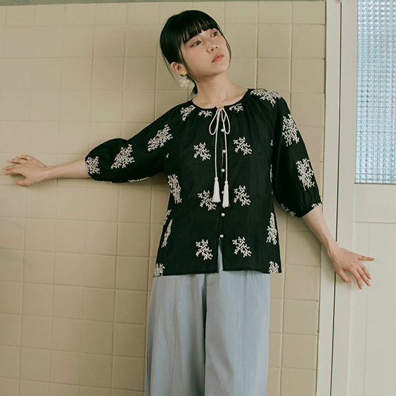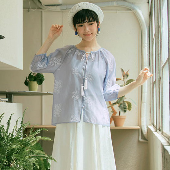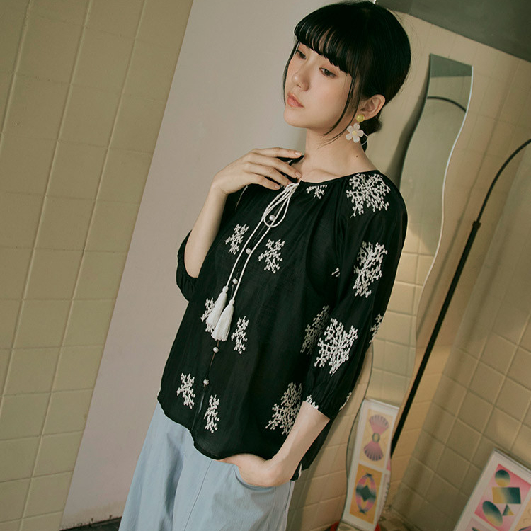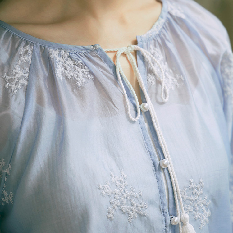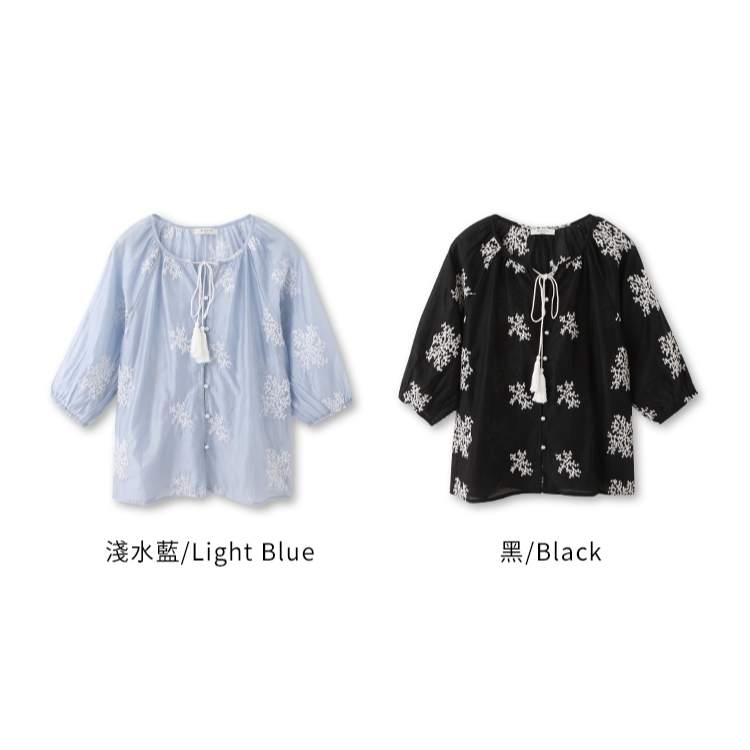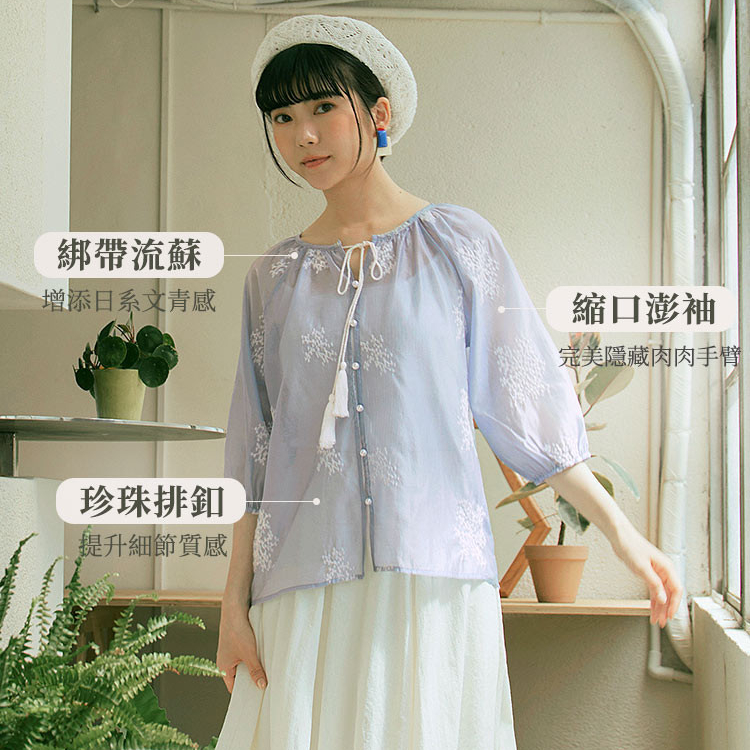 OB嚴選 微透肌刺繡流蘇綁帶珍珠排釦上衣 《AB19386》日系/現貨/女裝淺水藍,S|淺水藍,M|淺水藍,L|淺水藍,XL|黑,S|黑,M|黑,L|黑,XLT-shirtsOB嚴選官方旗艦店