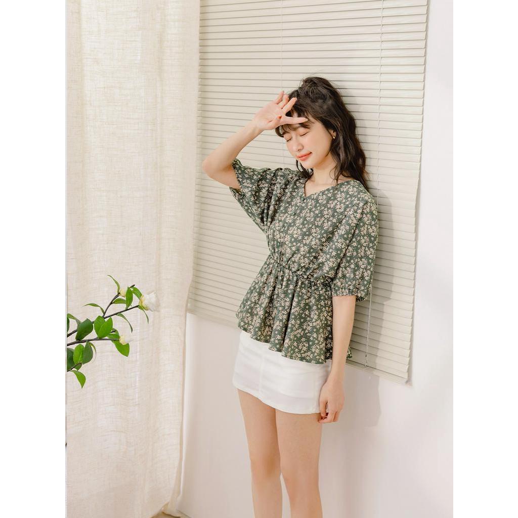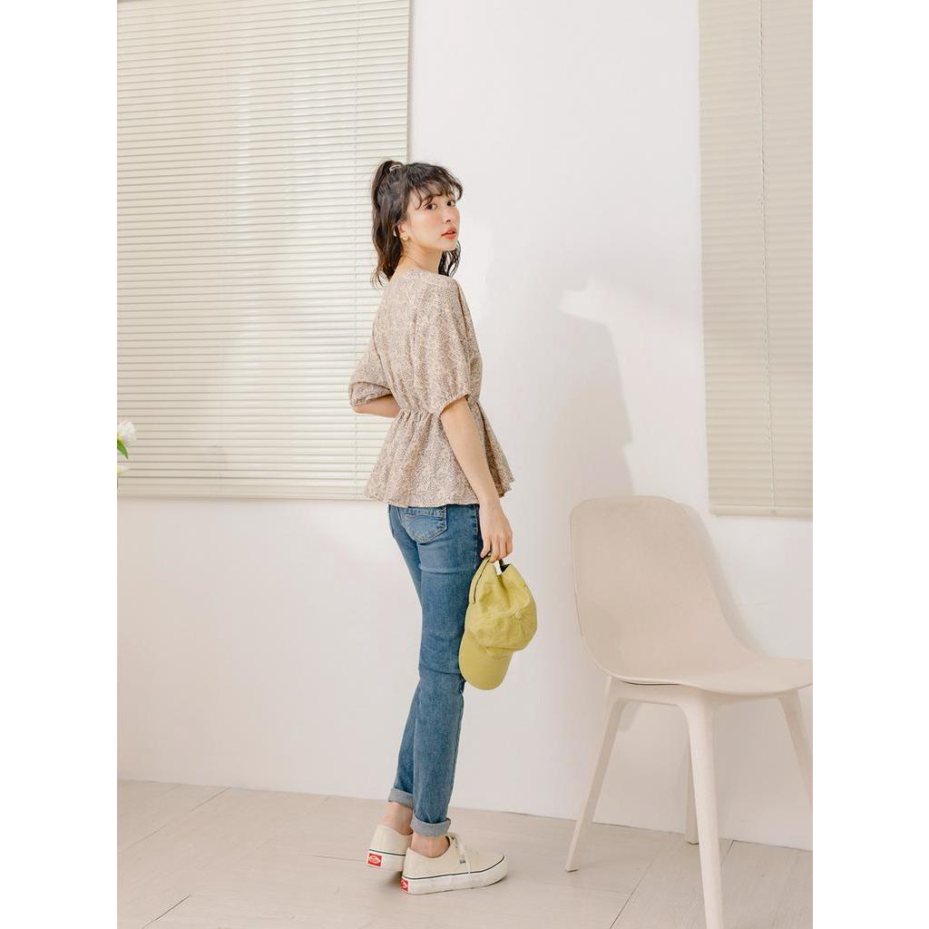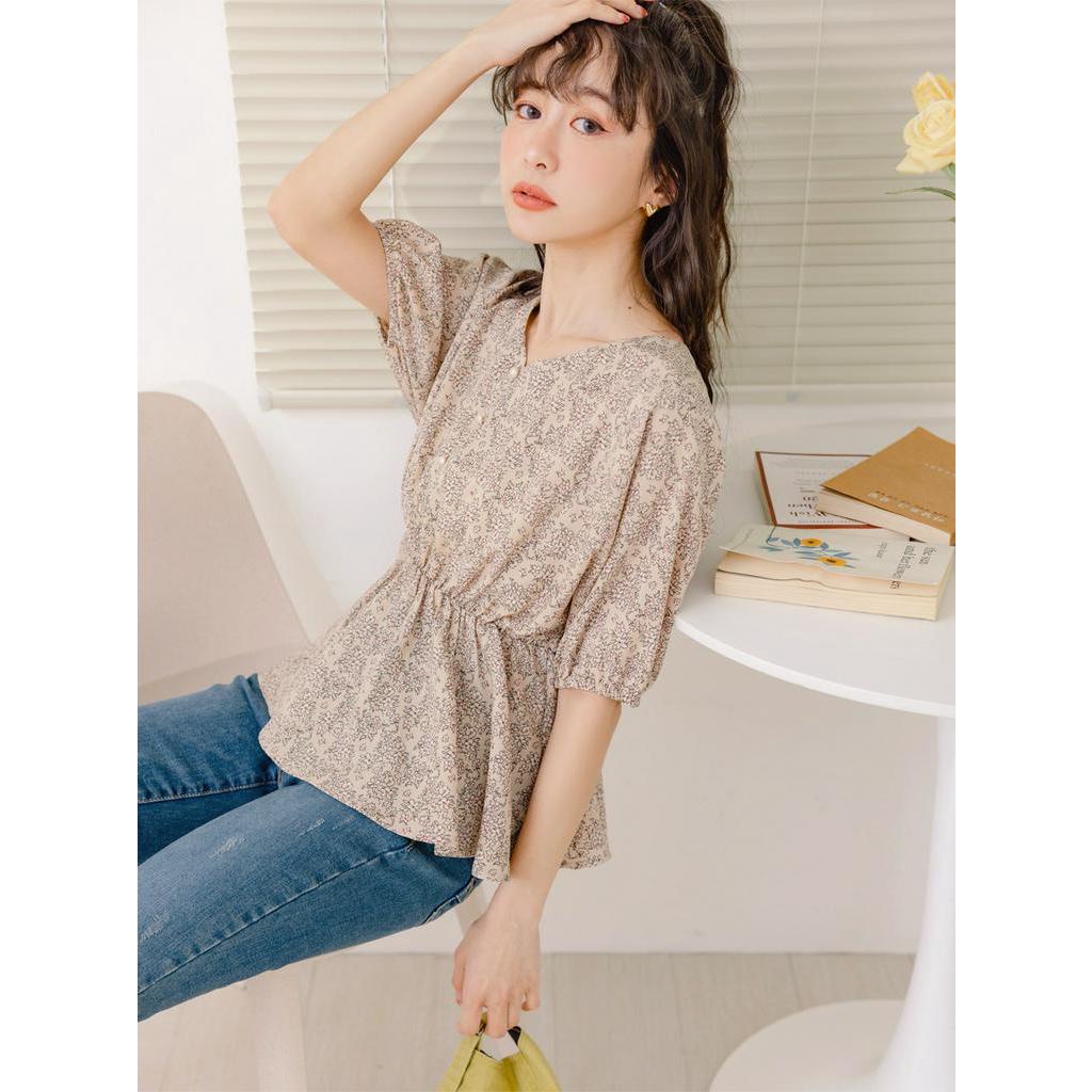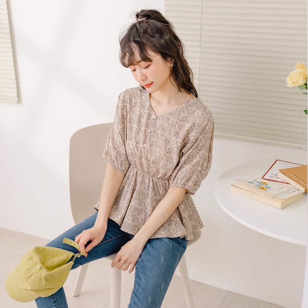 OB嚴選 小V臉.不易皺碎花收腰拋袖上衣 《AB18268》大尺碼/女裝/現貨杏,M|杏,L|杏,XL|杏,2L|綠,XL|綠,2L|綠,3L|杏,S|杏,3L|綠,S|綠,M|綠,LT-shirtsOB嚴選官方旗艦店