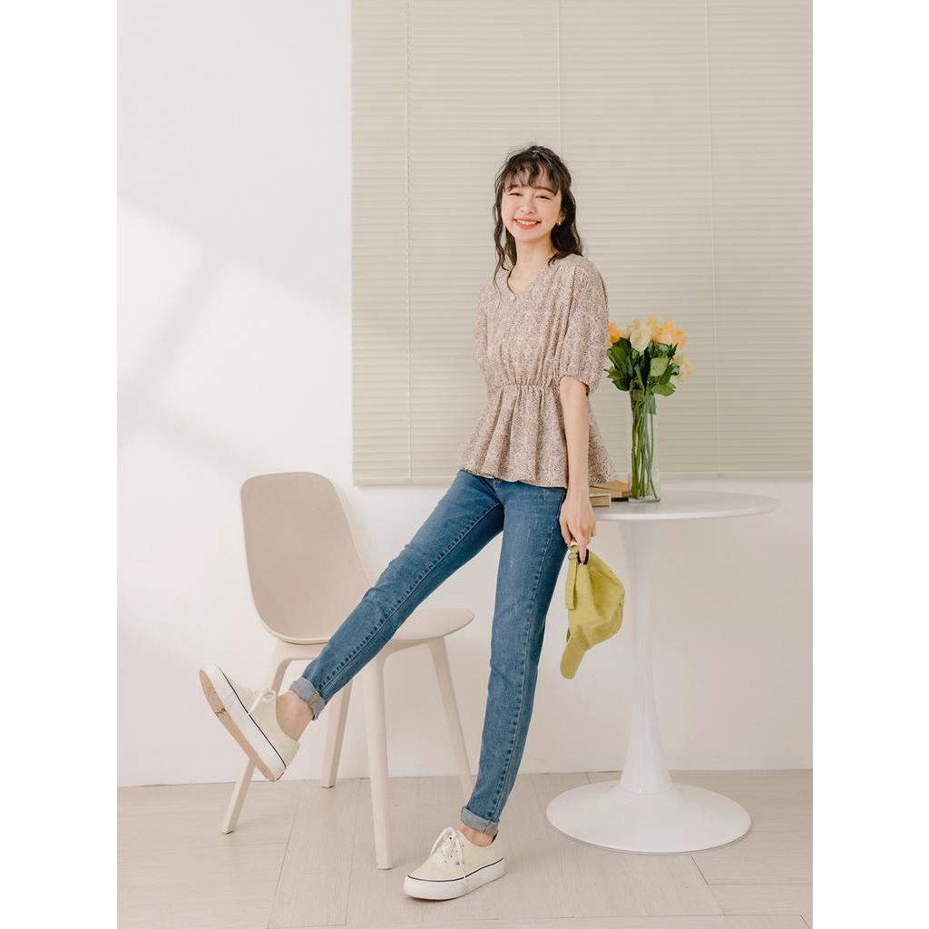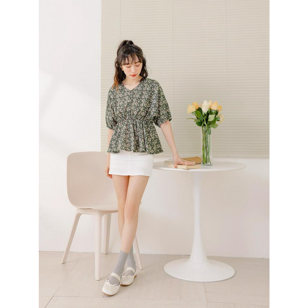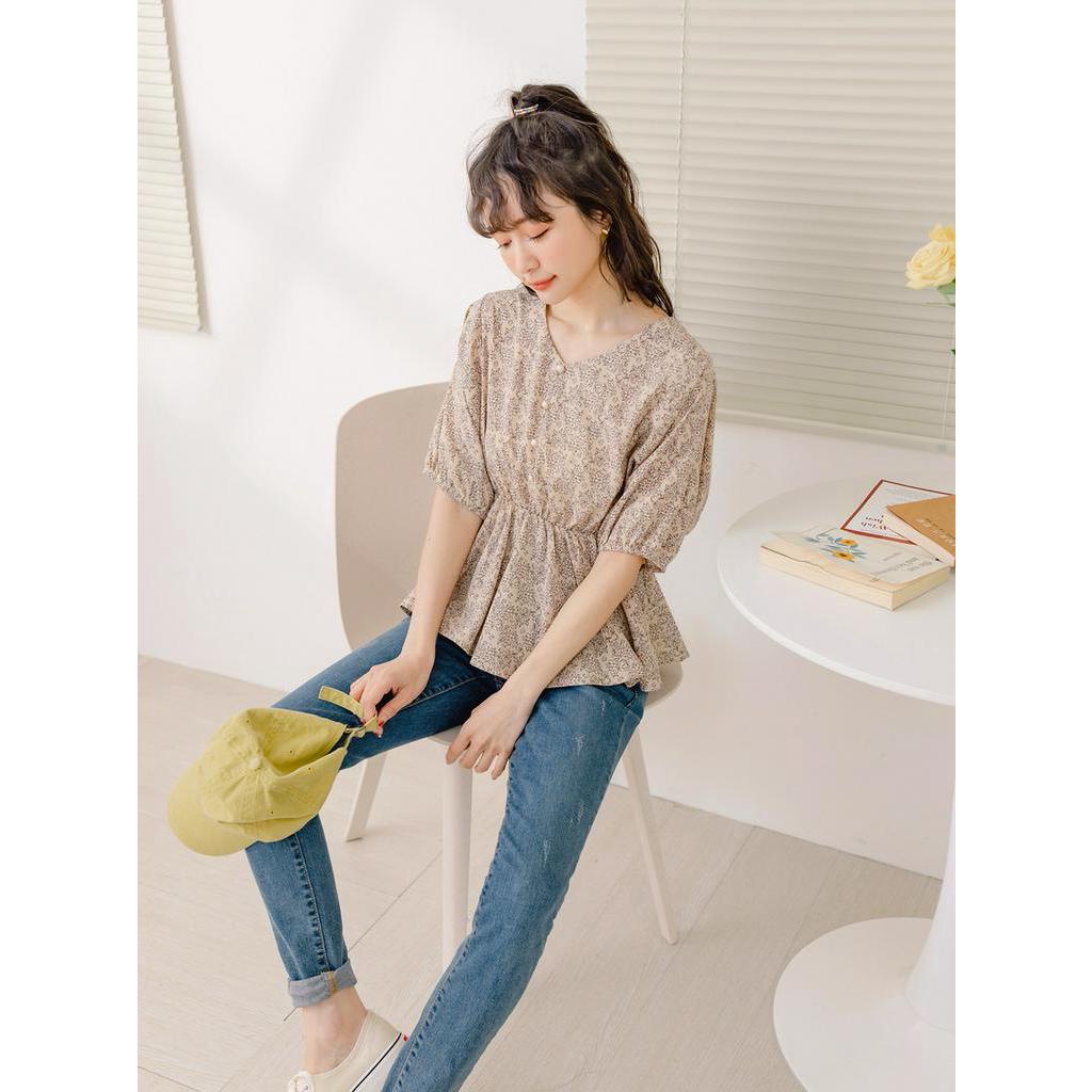 OB嚴選 小V臉.不易皺碎花收腰拋袖上衣 《AB18268》大尺碼/女裝/現貨杏,M|杏,L|杏,XL|杏,2L|綠,XL|綠,2L|綠,3L|杏,S|杏,3L|綠,S|綠,M|綠,LT-shirtsOB嚴選官方旗艦店