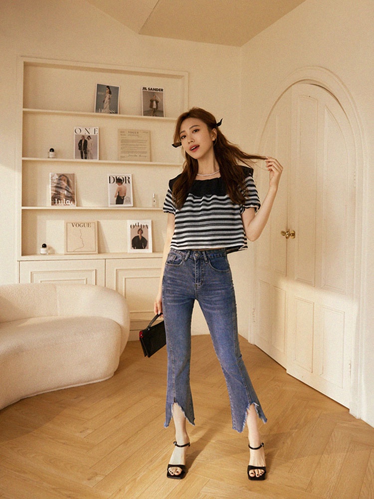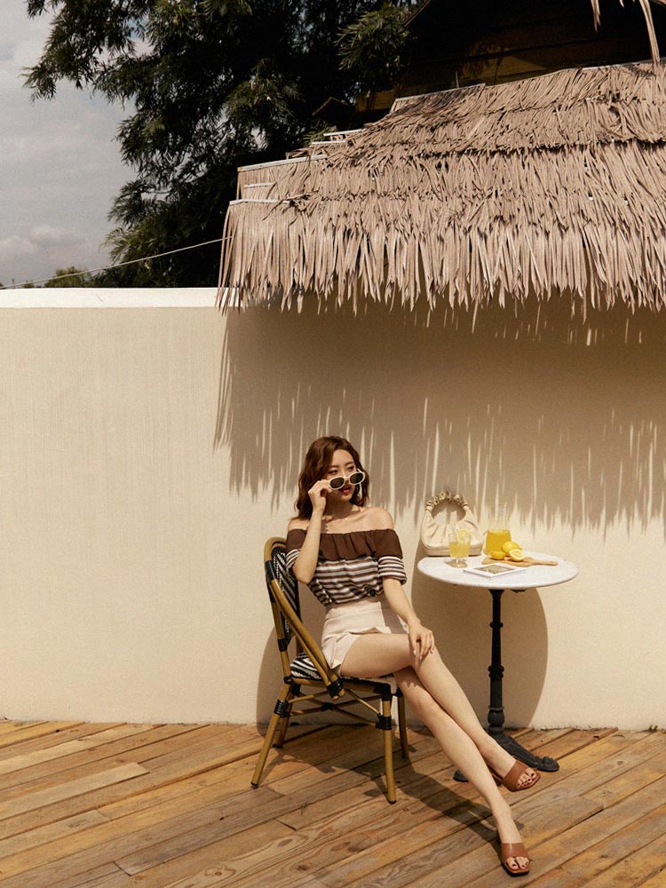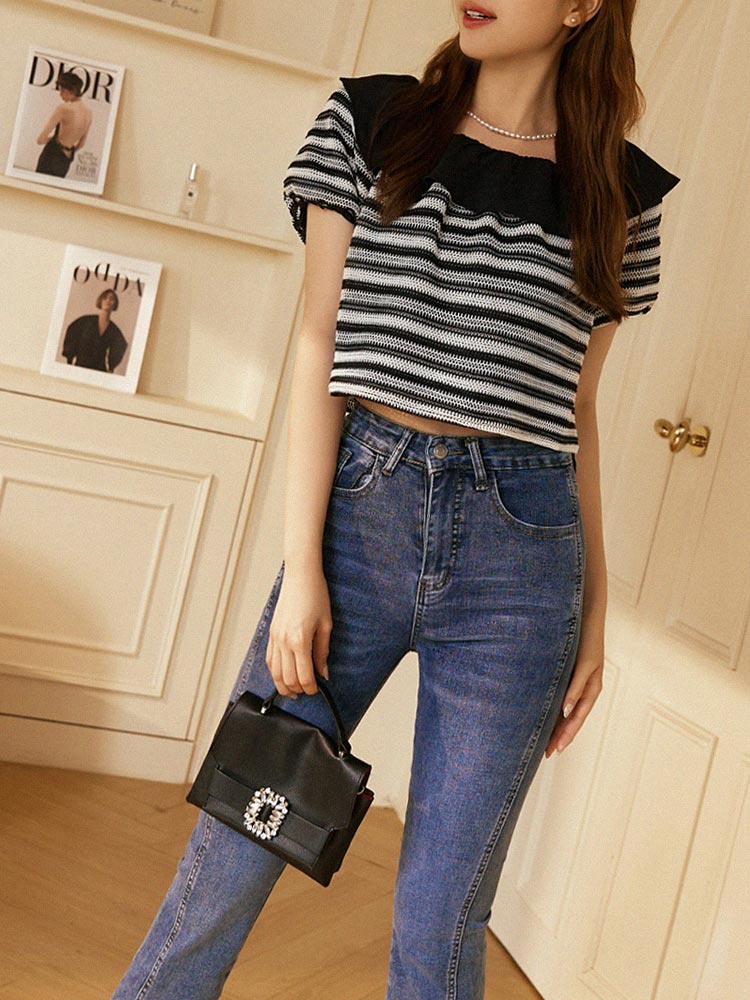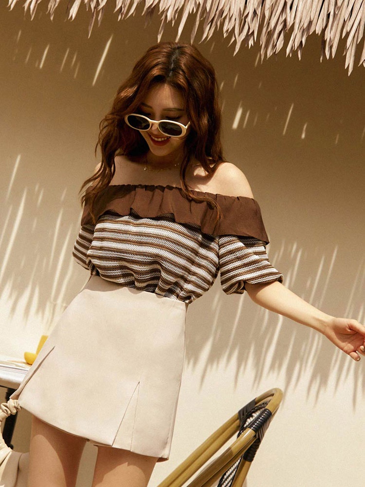 OB嚴選 波浪一字領條紋針織短版上衣 《AB18812》大尺碼/現貨/女裝焦糖,F|黑,FT-shirtsOB嚴選官方旗艦店
