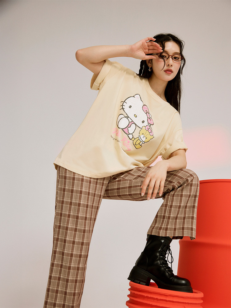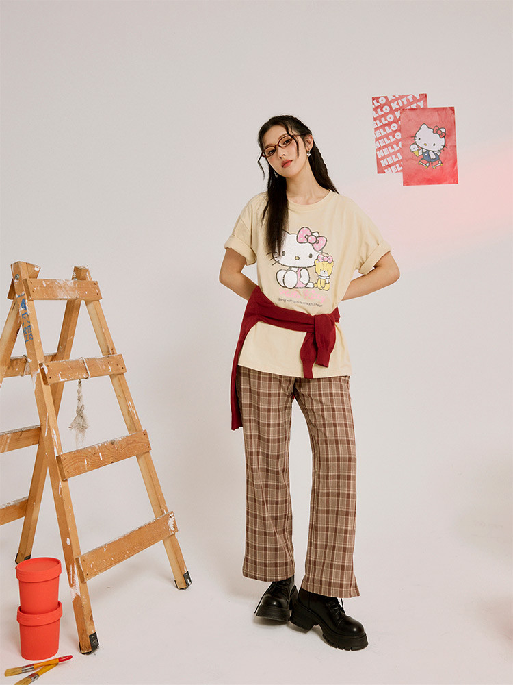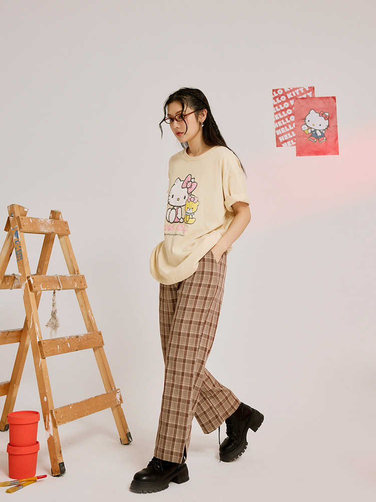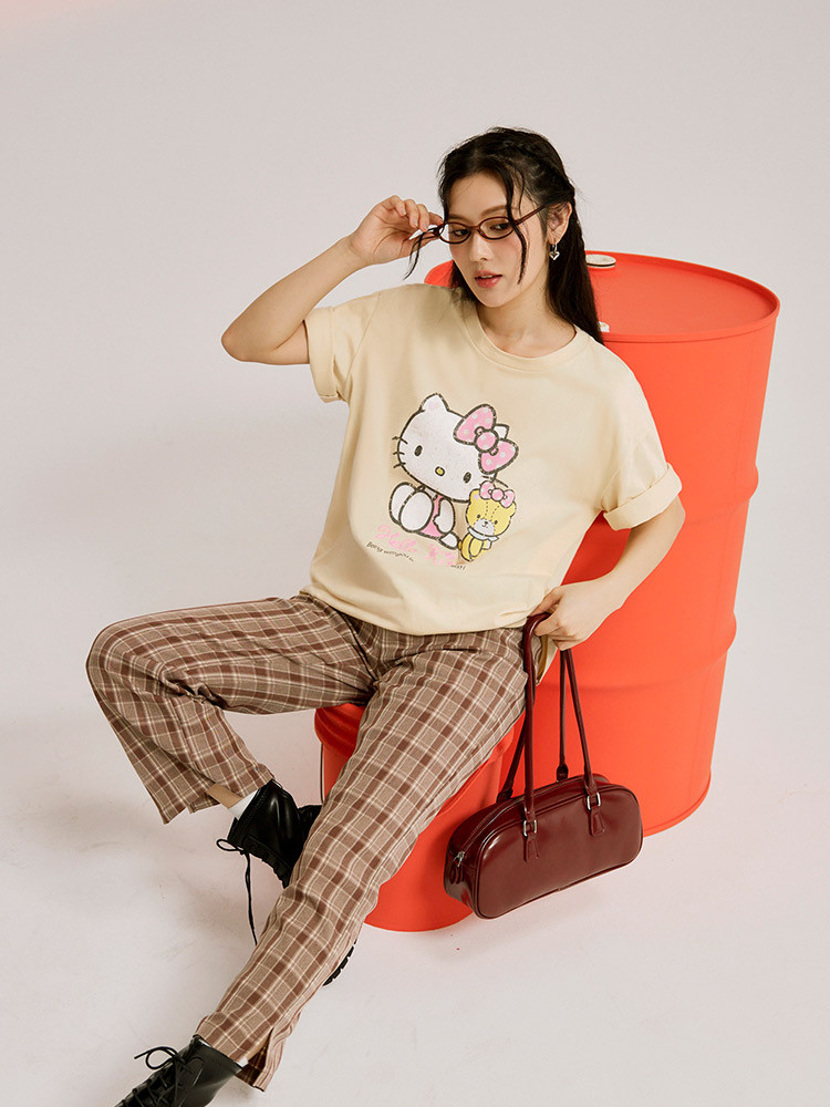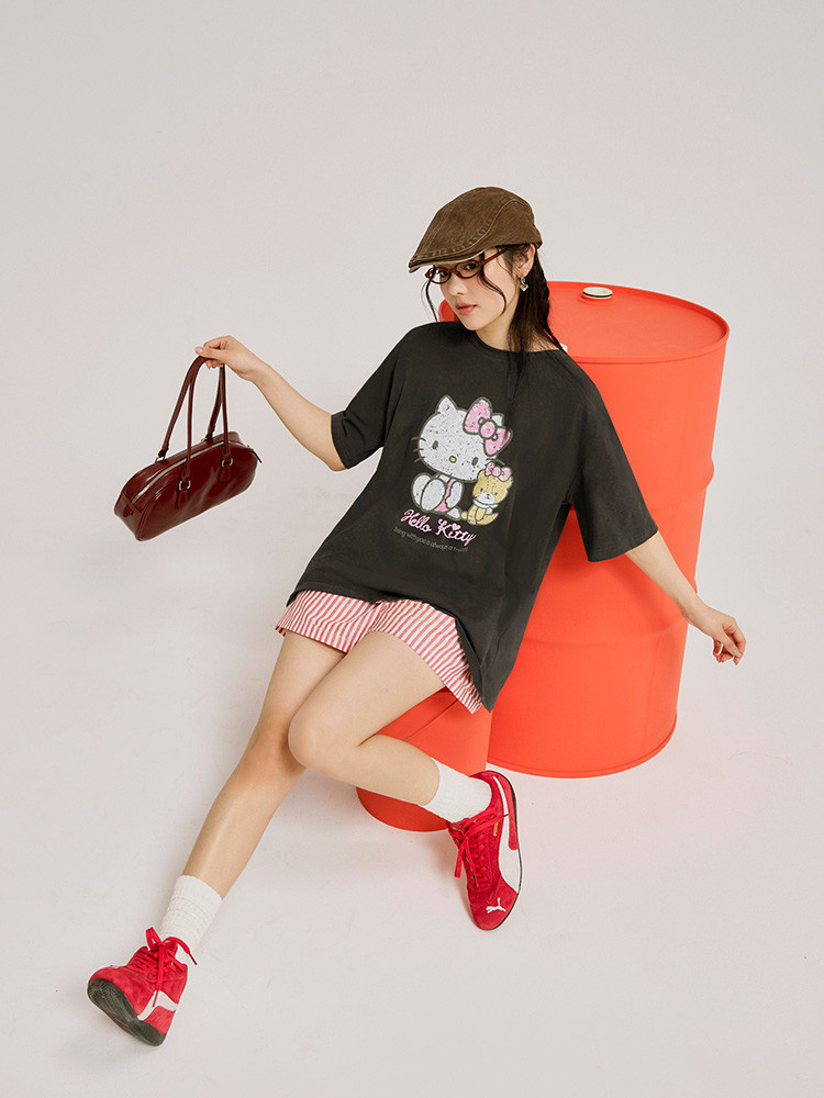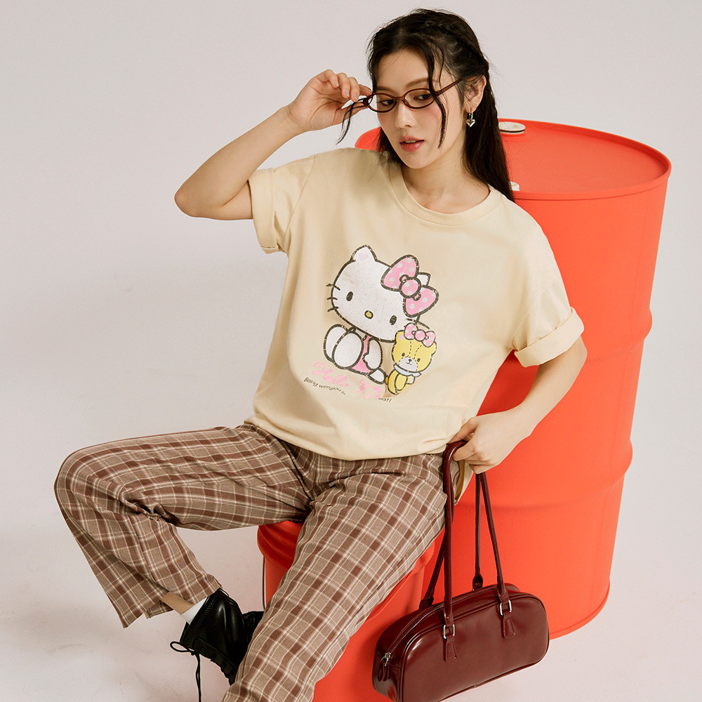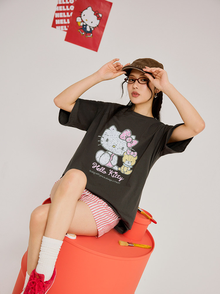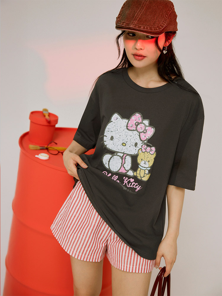 OB嚴選 KITTY 經典再現.純棉復古斑駁寬鬆印花TEE 《IK0064》杏,F|杏,XL|杏,2L|杏,3L|深灰,F|深灰,XL|深灰,2L|深灰,3LT-shirtsOB嚴選官方旗艦店