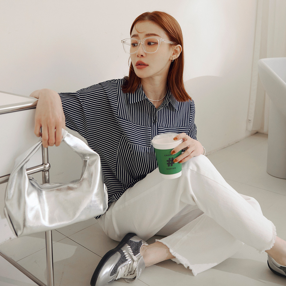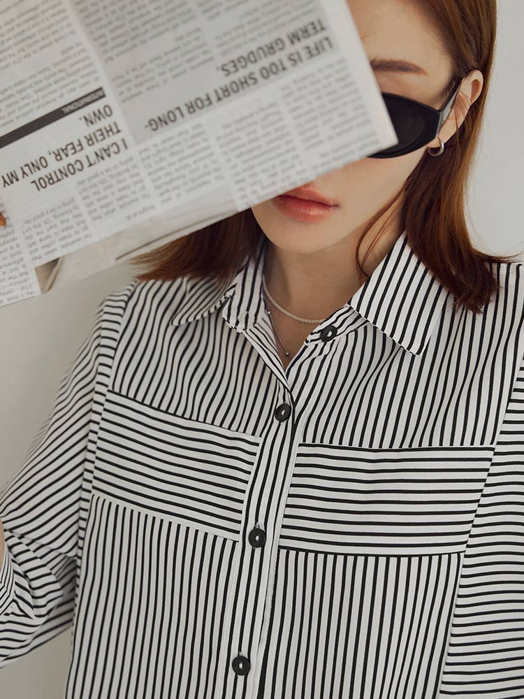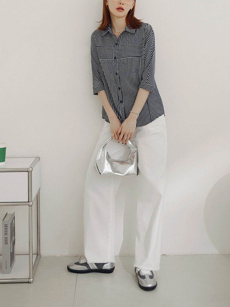 OB嚴選 拼接條紋雪紡五分袖襯衫上衣 《AB19280》大尺碼/現貨/女裝黑,S|黑,M|黑,L|黑,XL|黑,2L|黑,3L|深藍,S|深藍,M|深藍,L|深藍,XL|深藍,2L|深藍,3LT-shirtsOB嚴選官方旗艦店