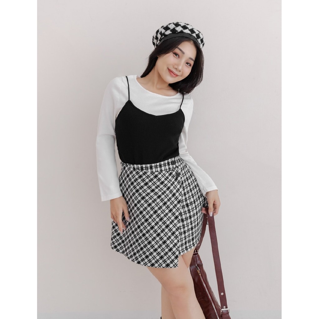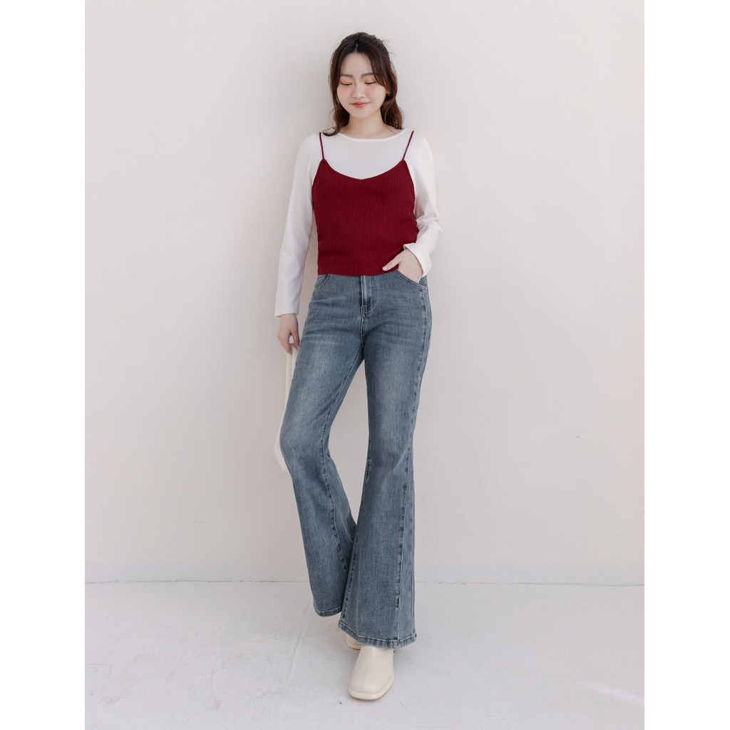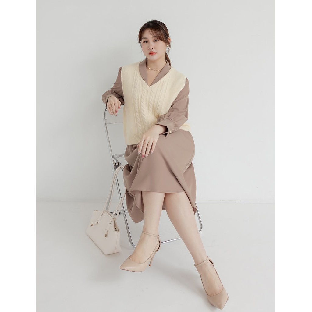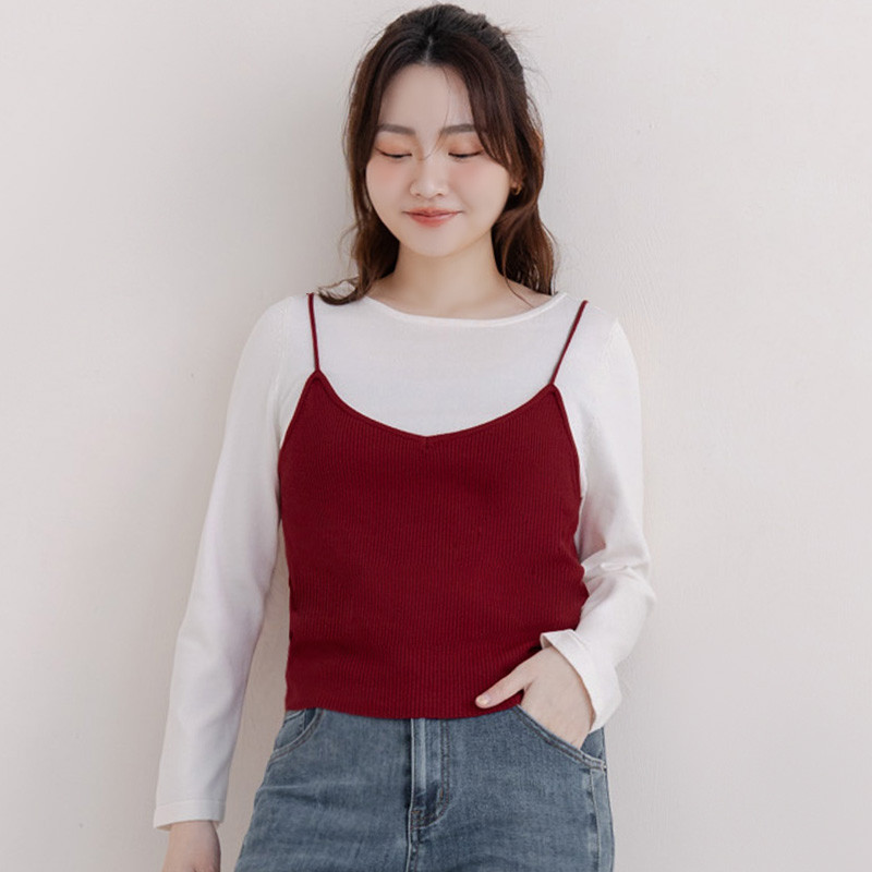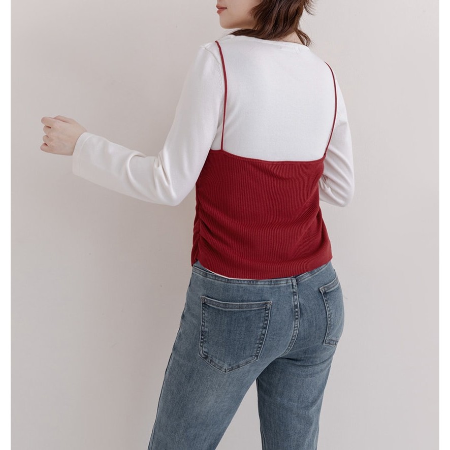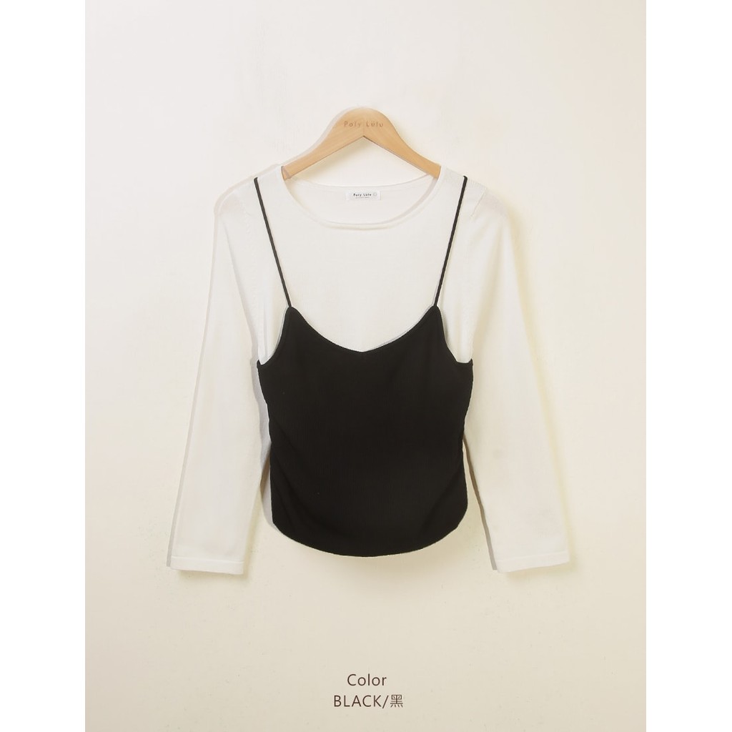 【PolyLulu】 韓系撞色假兩件抓褶針織吊帶長袖上衣 中大尺碼上衣