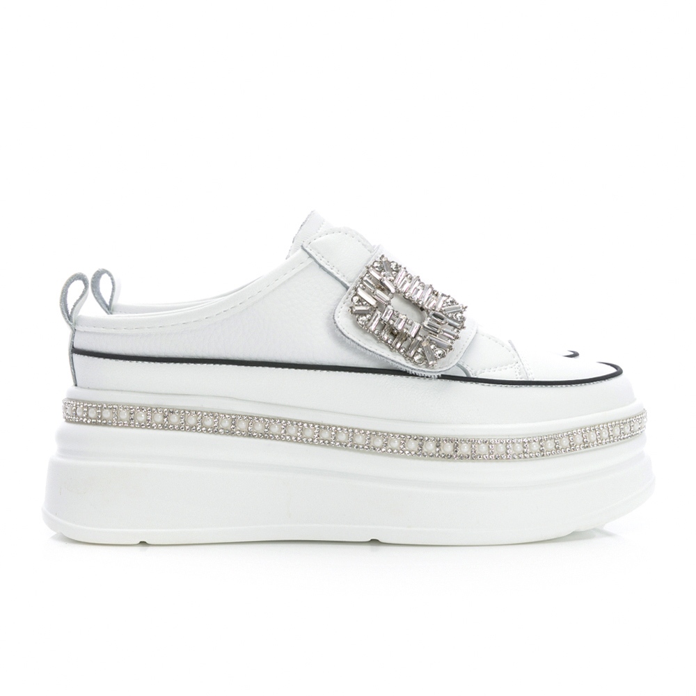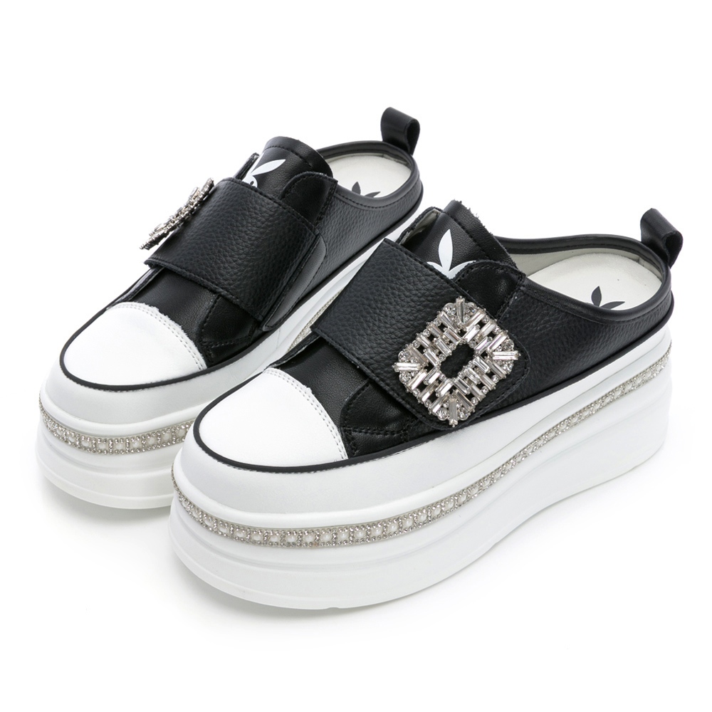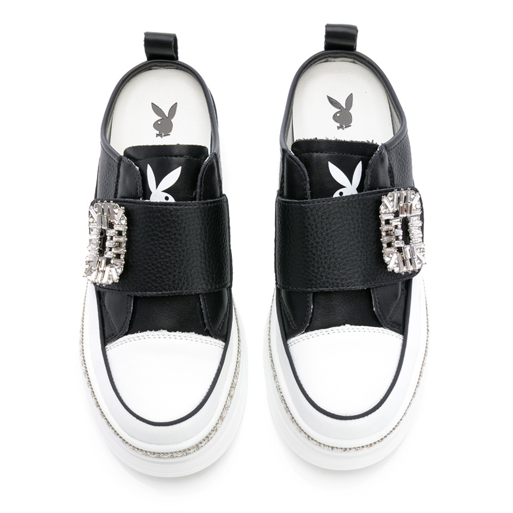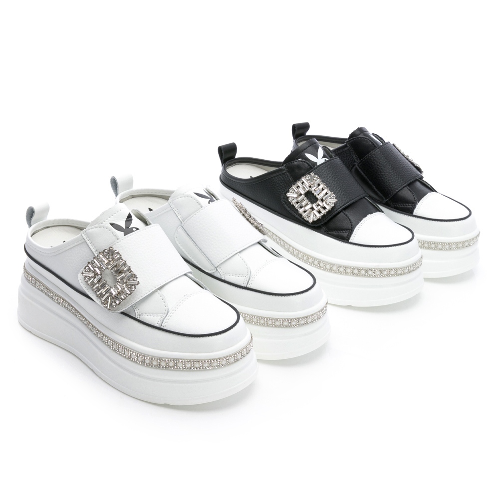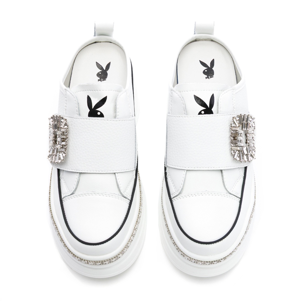 • PLAYBOY 閃耀奢華 真皮方鑽釦厚底穆勒鞋-白/黑(PY1665)
