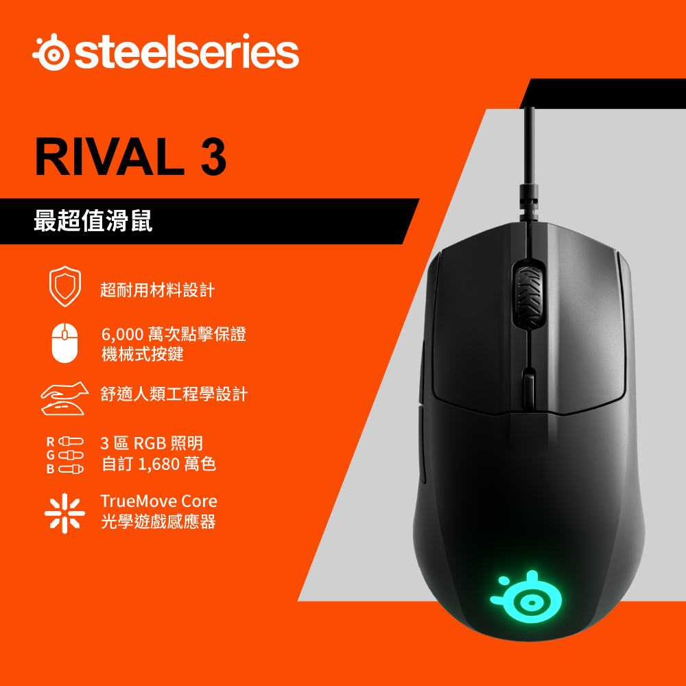SteelSeries 賽睿 Rival 3 有線電競滑鼠 輕量設計 人體工學 光學感測器 電競滑鼠 遊戲滑鼠主商品|主商品+素面鼠墊MiceSteelSeries賽睿官方旗艦店