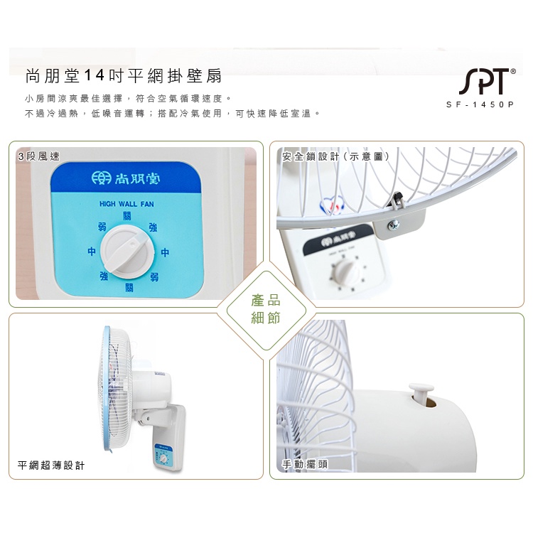 尚朋堂14吋平網單拉高級掛壁扇SF-1450P尚朋堂14吋平網單拉高級掛壁扇SF-1450PCoolingSPT精緻家電館