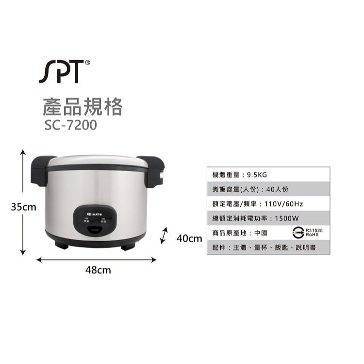 【尚朋堂】40人份煮飯電子鍋SC-7200新品|福利品(外表小刮傷)|新品一次兩台Rice CookersSPT精緻家電館