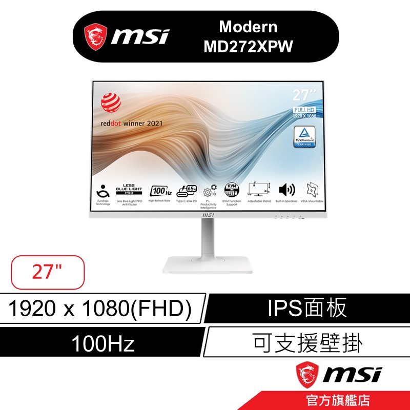msi 微星 MSI Modern MD272XPW 27吋 平面螢幕 FHD/100Hz/內建喇叭/白色Modern MD272XPW|MD272XPW+無線充電盤MSI微星品牌旗艦店