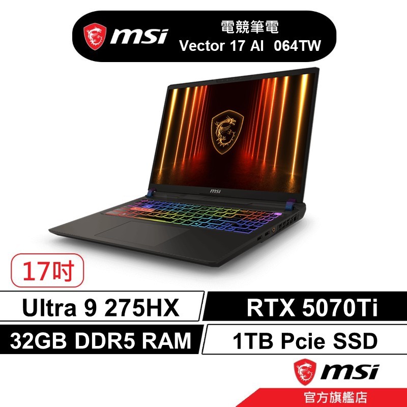 【RTX50系列】msi 微星 Vector 17 HX AI 064TW Ultra9/RTX5070TiVector 17HX AI 064TW,【客製】96GB Ram/2T+2T|Vector 17HX AI 064TW,原廠規格(32G/1TB)|Vector 17HX AI 064TW,【客製】64GB Ram|Vector 17HX AI 064TW,【客製】96GB Ram|Vector 17HX AI 064TW,【客製】+1TB Pcie SSD|Vector 17HX AI 064TW,【客製】+2TB Pcie SSD|Vector 17HX AI 064TW,【客製】+4TB Pcie SSD|Vector 17HX AI 064TW,【客製】64GB Ram/+1T SSD|Vector 17HX AI 064TW,【客製】64GB Ram/+2T SSD|Vector 17HX AI 064TW,【客製】64GB Ram/+4T SSD|Vector 17HX AI 064TW,【客製】96GB Ram/+1T SSD|Vector 17HX AI 064TW,【客製】96GB Ram/+2T SSD|Vector 17HX AI 064TW,【客製】96GB Ram/+4T SSDMSI微星品牌旗艦店
