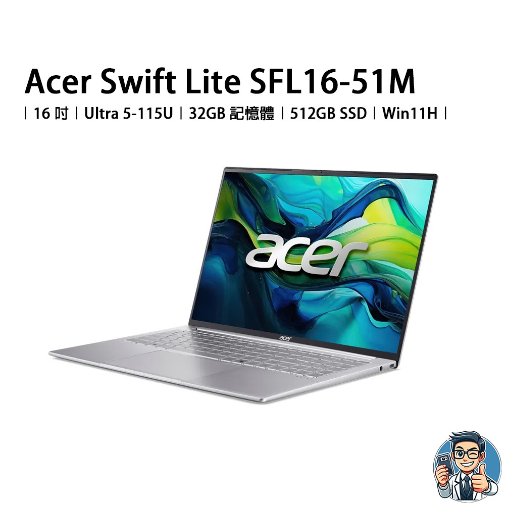 Acer Swift Lite SFL16-51M 16吋 筆記型電腦 Ultra 5-115U 32GB 512GB拆封福利品:功能正常,90%-99% 新|拆封福利品:功能正常,80%-89% 新Mr.Reset | 3C 福利品的銷售專家