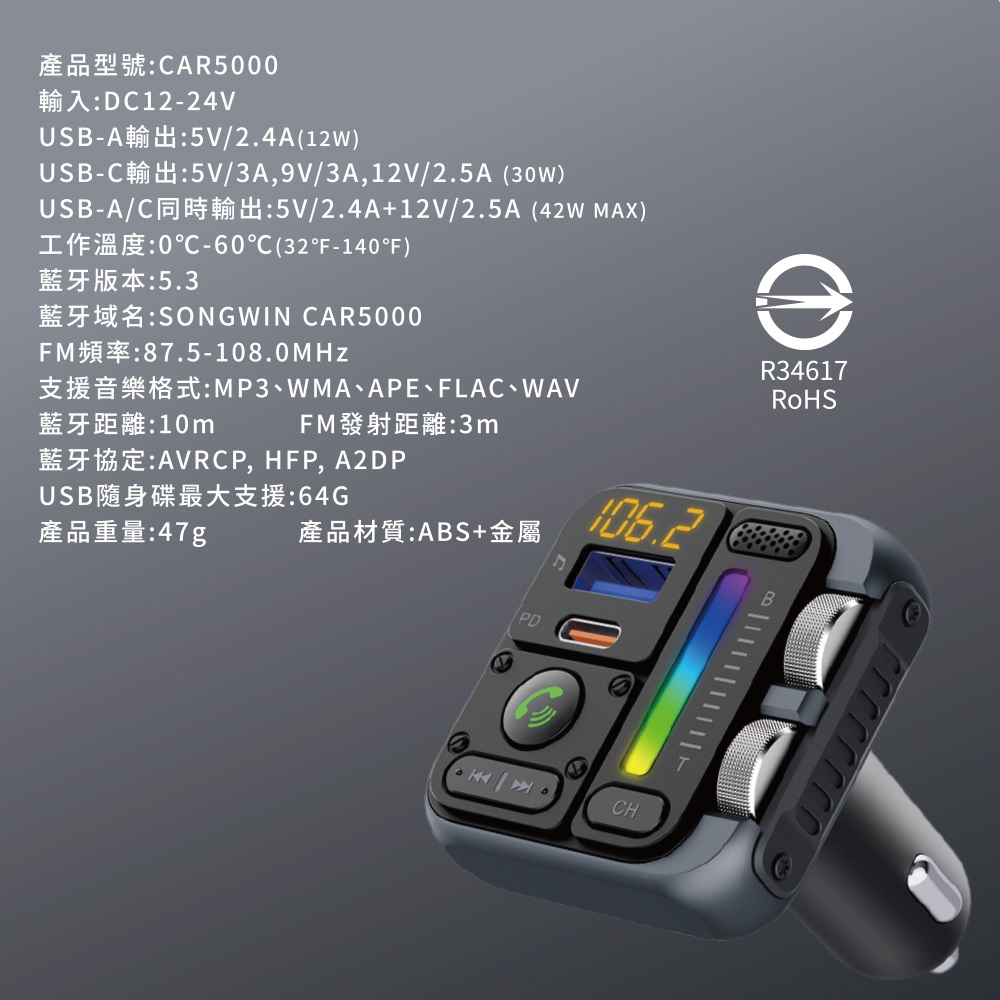 • Songwin CAR5000 藍芽車用播放器 車用MP3 藍芽 播音樂 藍芽接收器 PD30W快速充電 -現貨免運