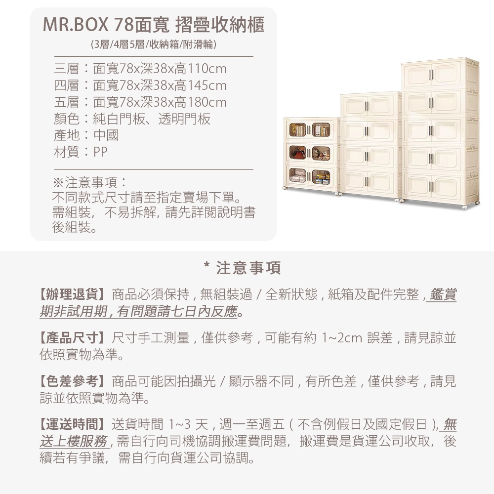 Mr.box 78面寬 摺疊雙開門 三層 四層 五層 收納櫃-附滑輪 兩種面板可選五層【不透明面板】|四層【透明面板】|四層【不透明面板】|五層【透明面板】|三層【透明面板】|三層【不透明面板】Storage Boxes, Bags & BasketsMr.Box l 收納箱 收納櫃 洗衣籃 曬衣架 行李箱