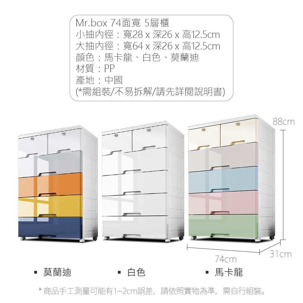 Mr.box 74大面寬-時尚5層收納櫃(2小抽+4大抽)-附輪 三色可選 免運 台灣出貨 024301馬卡龍|白色|莫蘭迪Storage Boxes, Bags & BasketsMr.Box l 收納箱 收納櫃 洗衣籃 曬衣架 行李箱