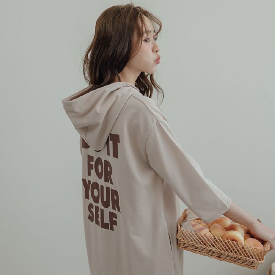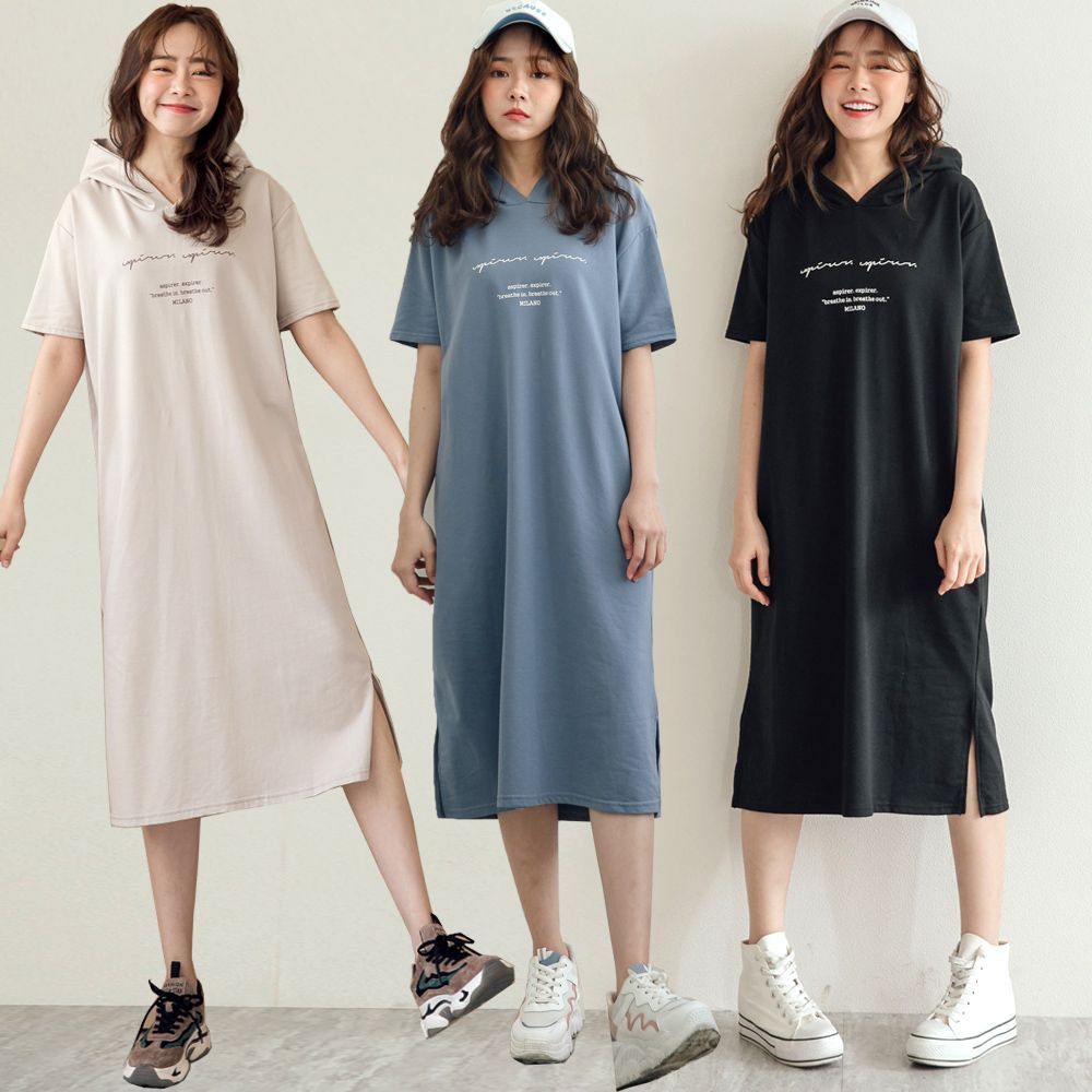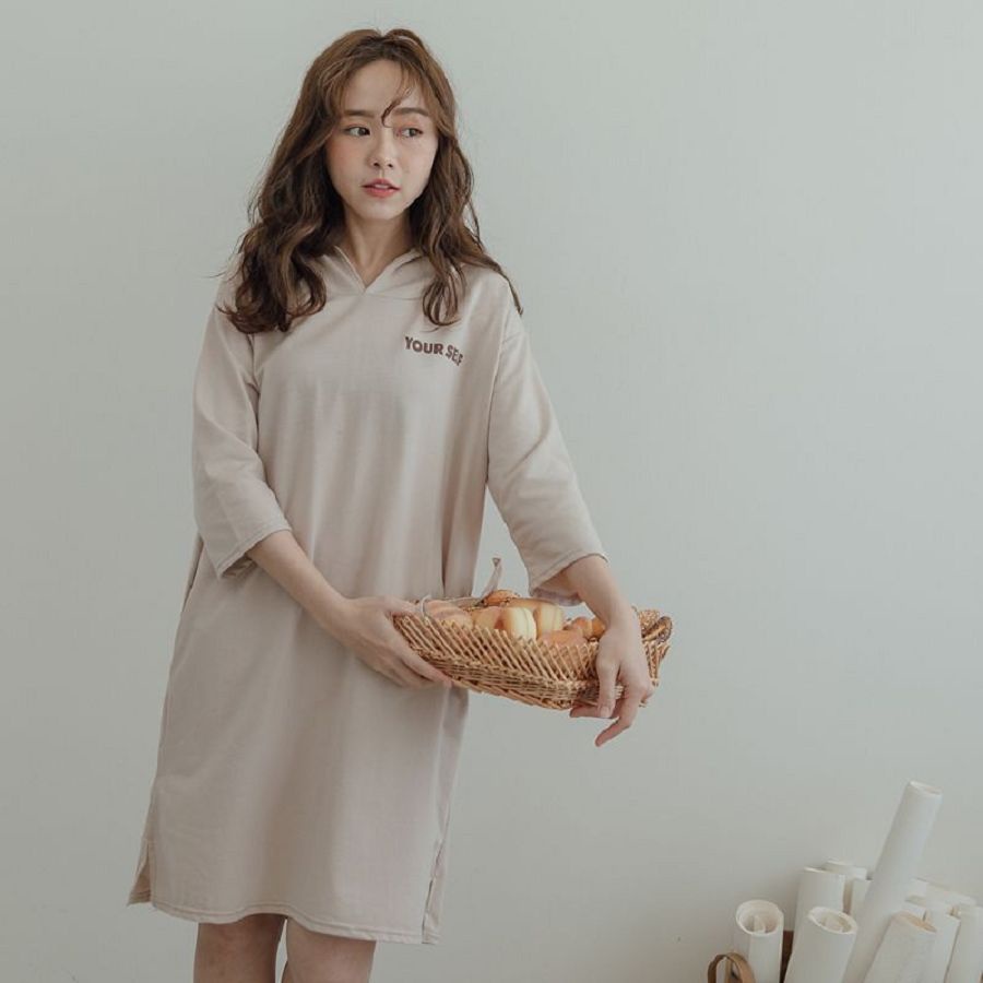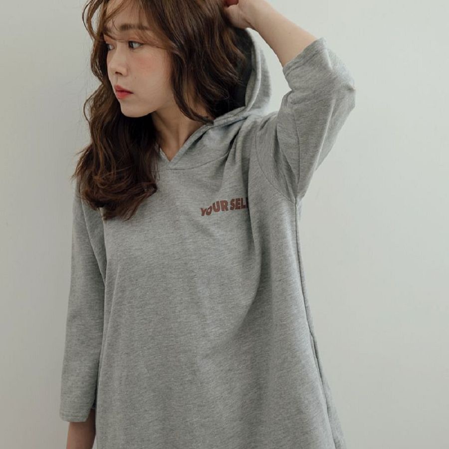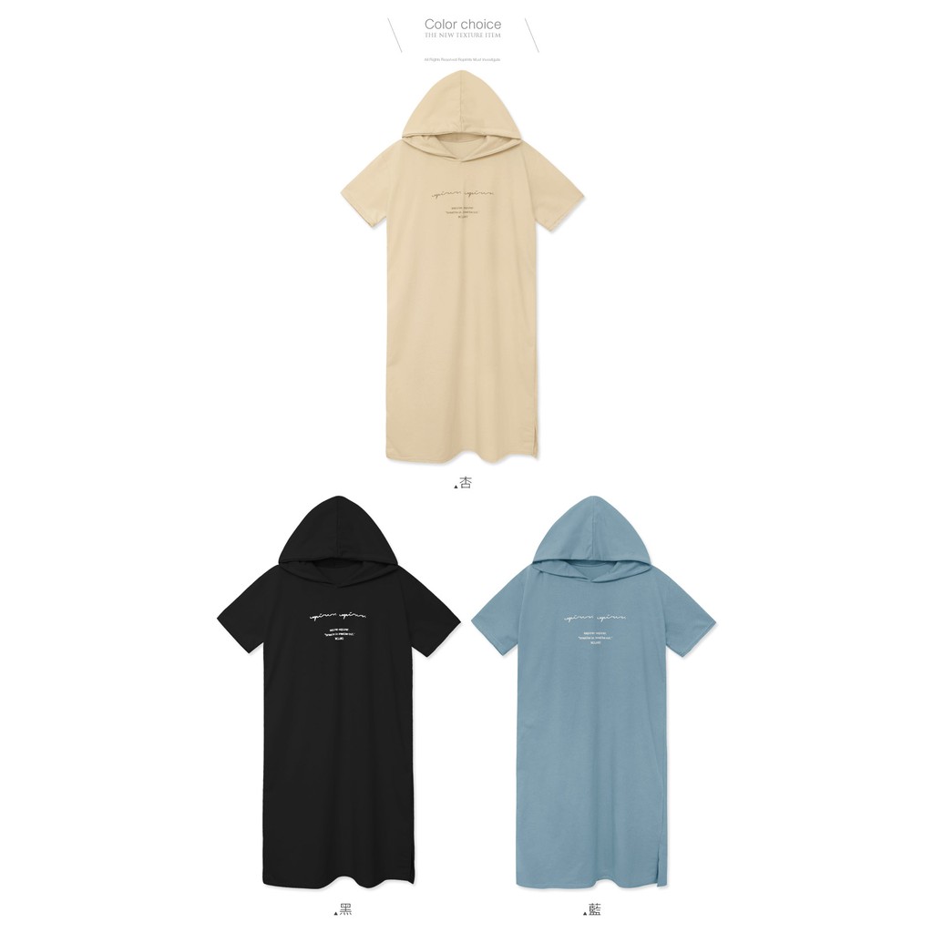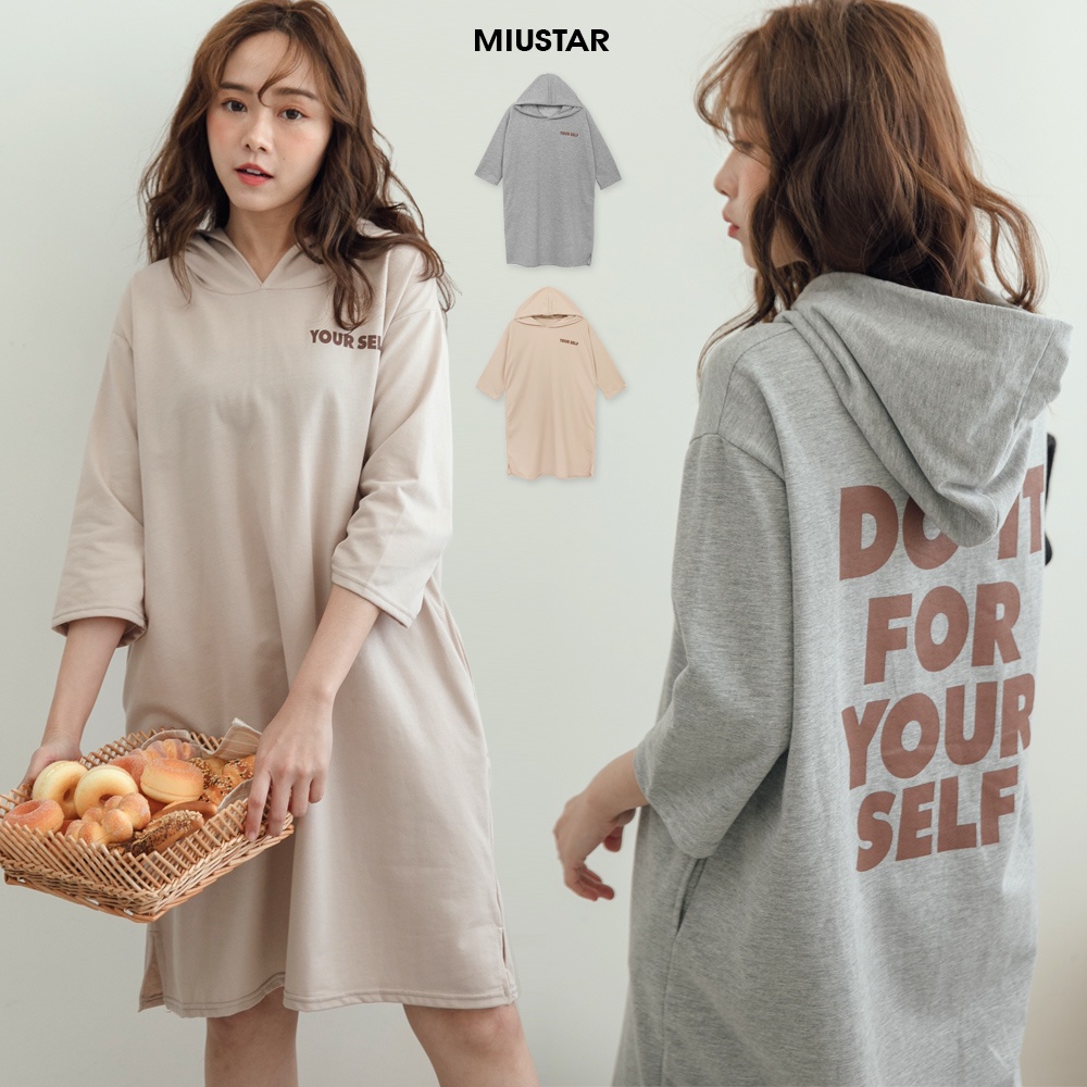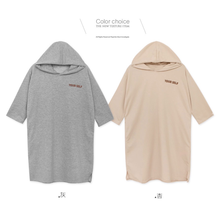MIUSTAR 五分袖側口袋開衩連帽膠印棉質洋裝(共2色)0207 預購 【NL0199RE】杏F|灰FHoodiesMIUSTAR