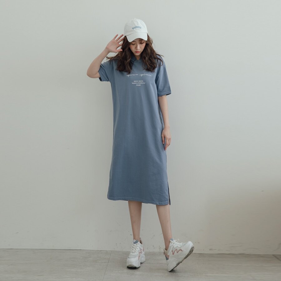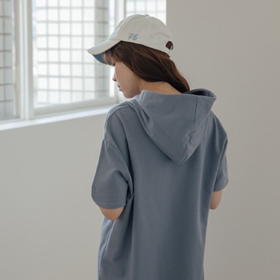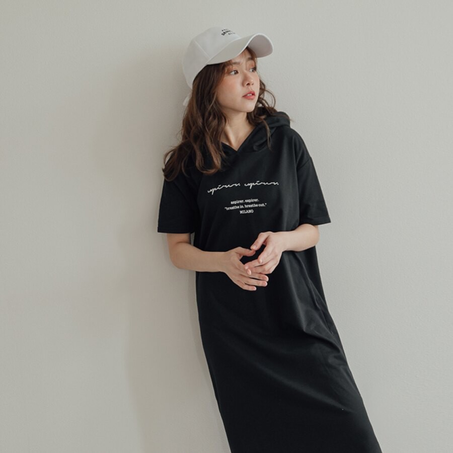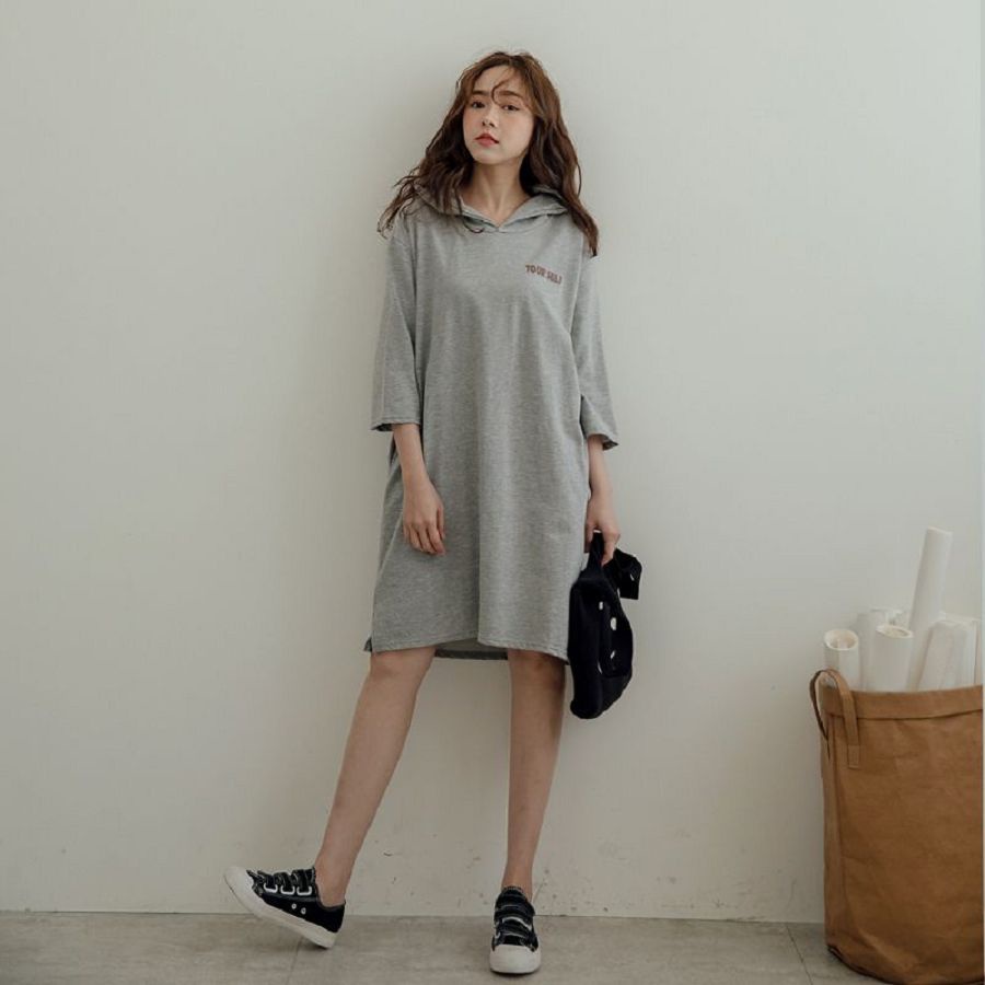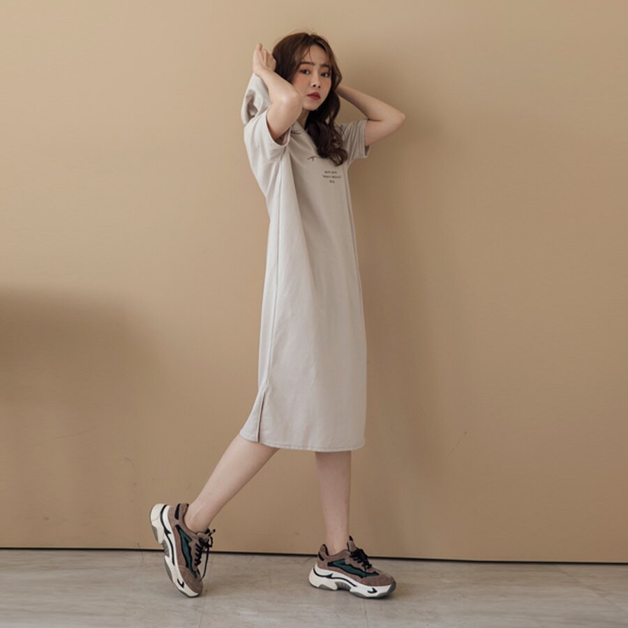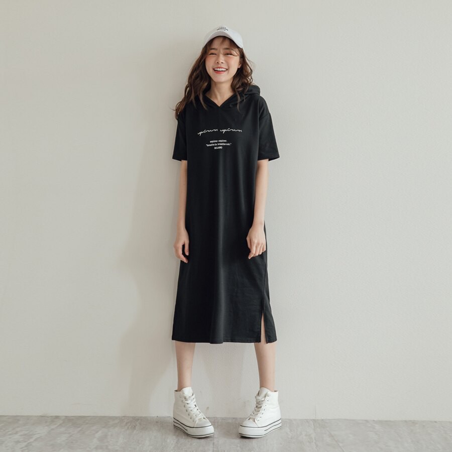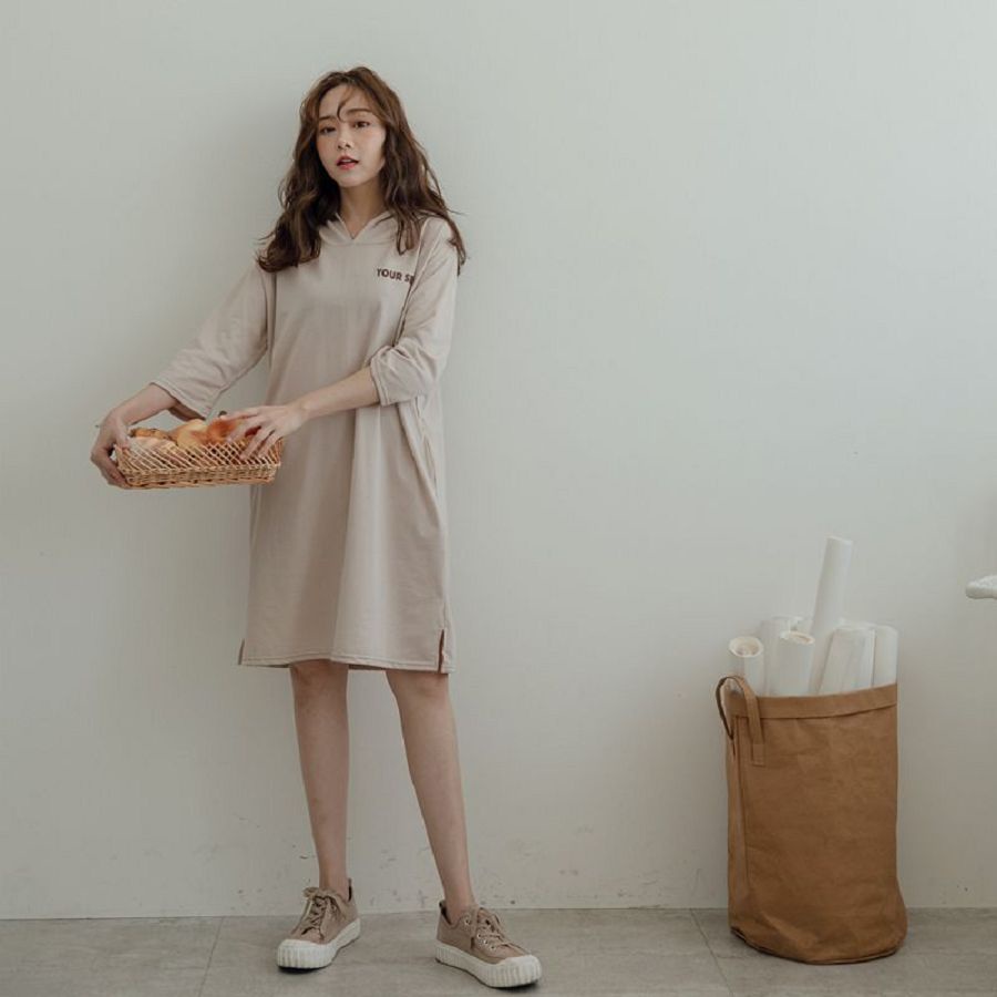 MIUSTAR 五分袖側口袋開衩連帽膠印棉質洋裝(共2色)0207 預購 【NL0199RE】杏F|灰FHoodiesMIUSTAR