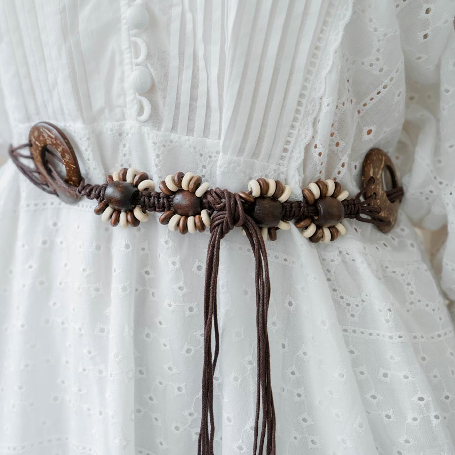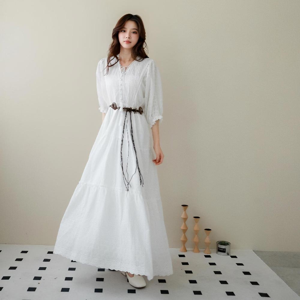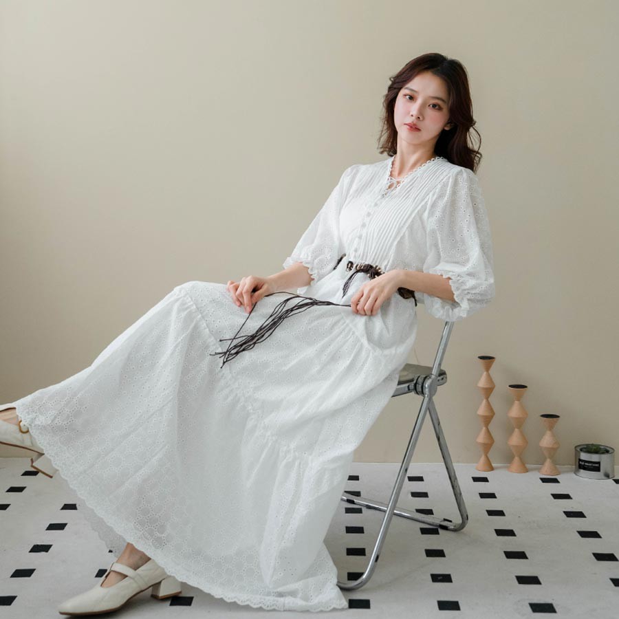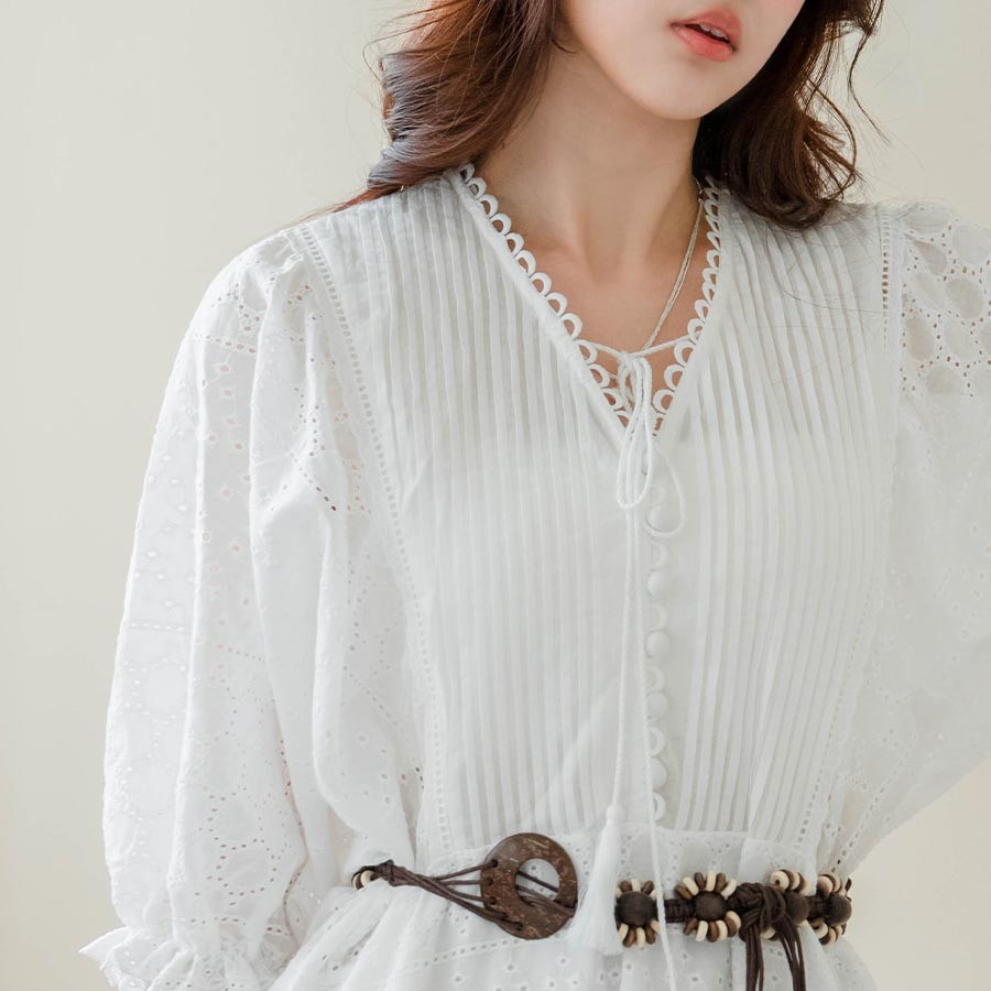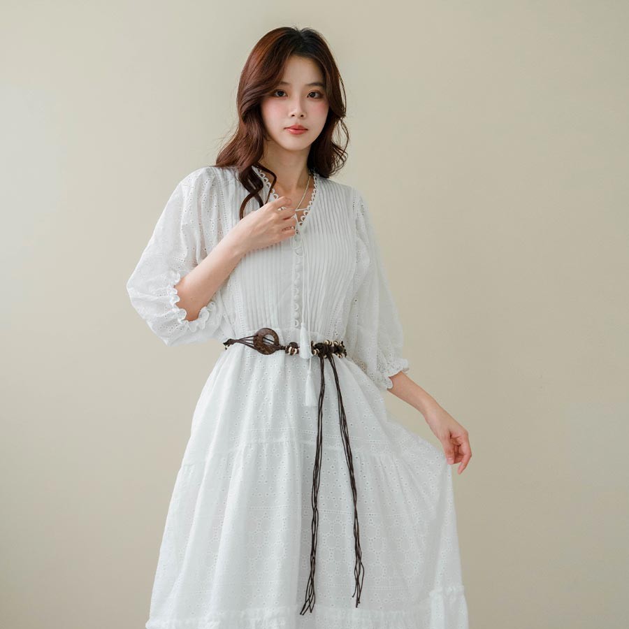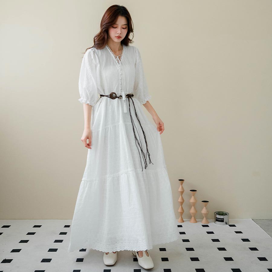 MIUSTAR 附腰帶!燒花蕾絲鏤空包釦流蘇綁帶棉麻長洋裝(共1色)0715 預購【NR1514】白FMIUSTAR