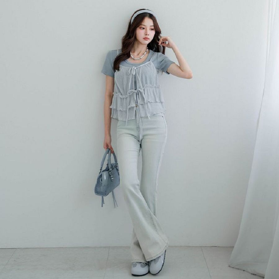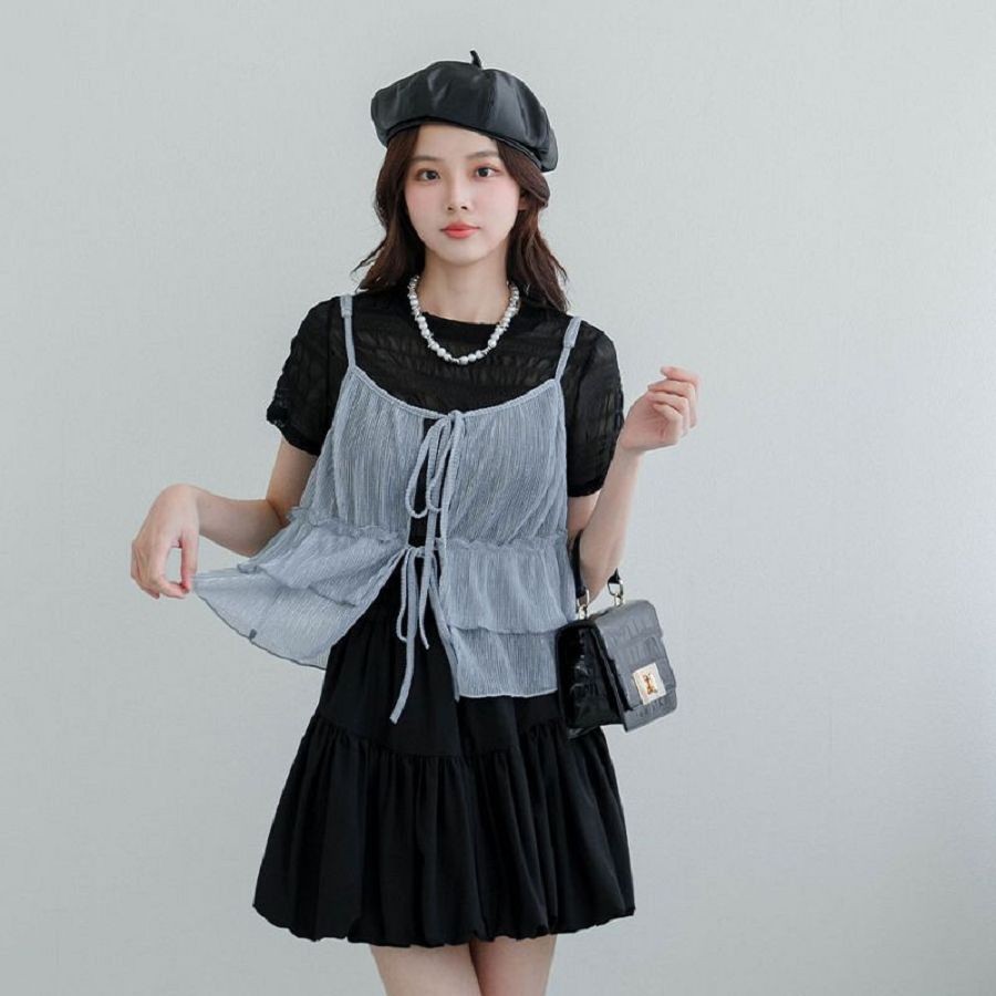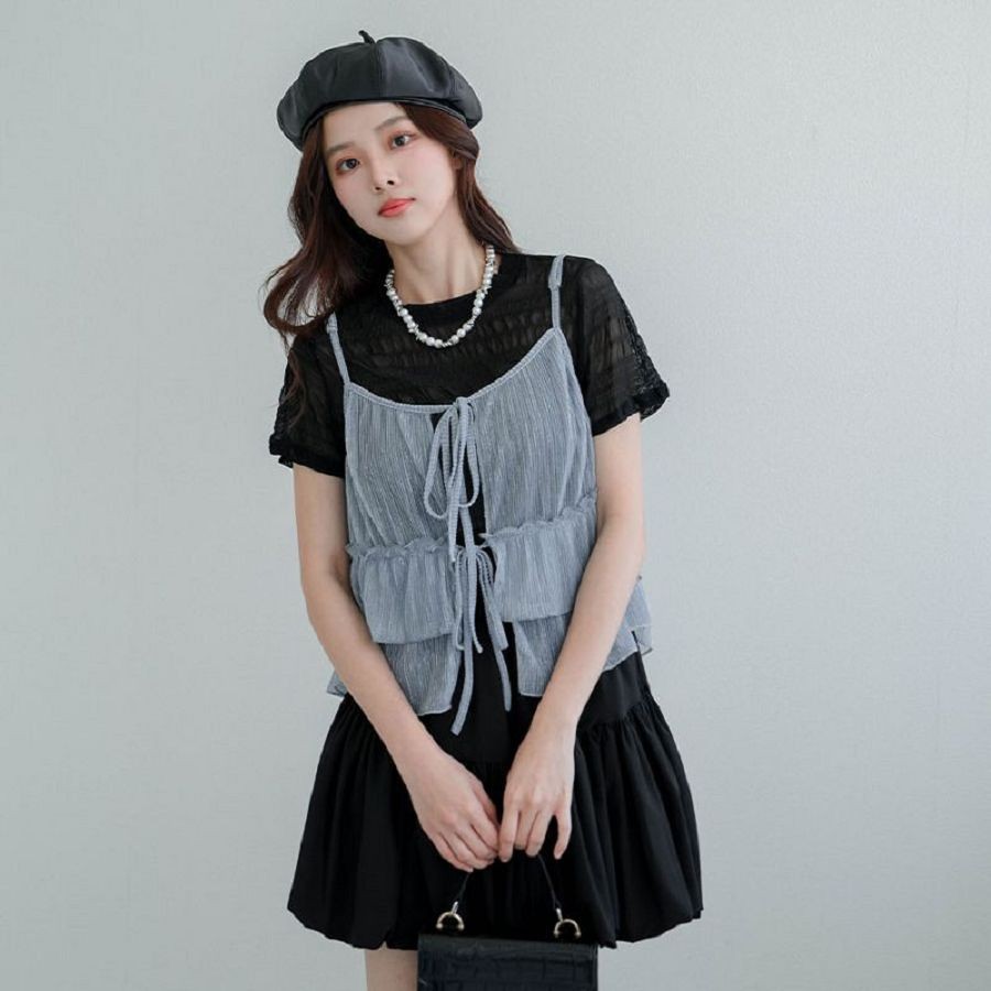 MIUSTAR 可調細肩銀紗線壓紋蛋糕層次綁帶上衣(共2色)0708 預購【NR1567】灰F|藍FT-shirtsMIUSTAR