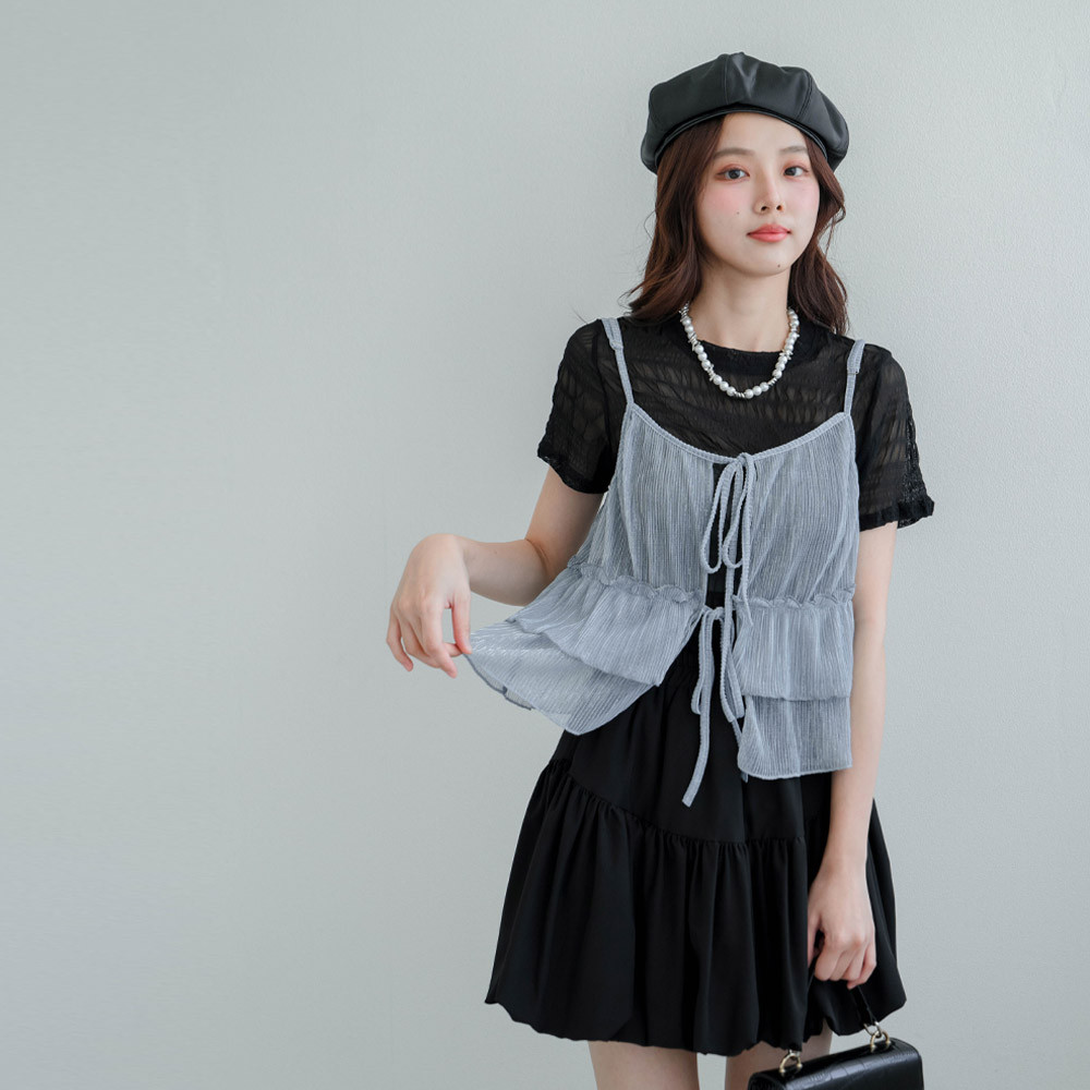 MIUSTAR 可調細肩銀紗線壓紋蛋糕層次綁帶上衣(共2色)0708 預購【NR1567】