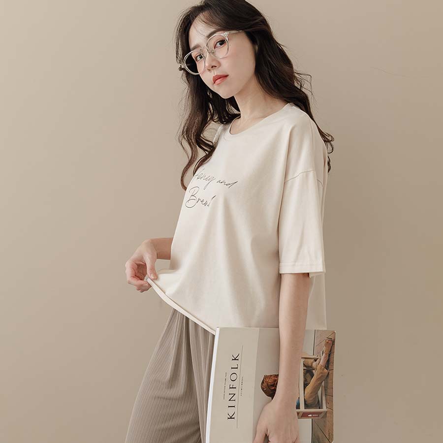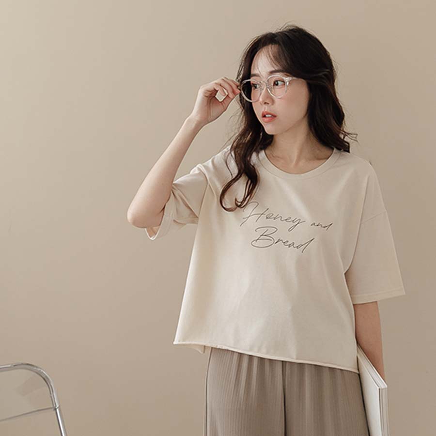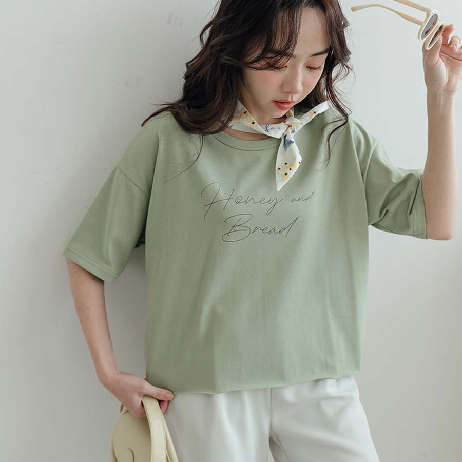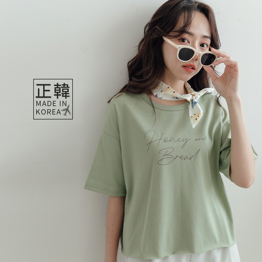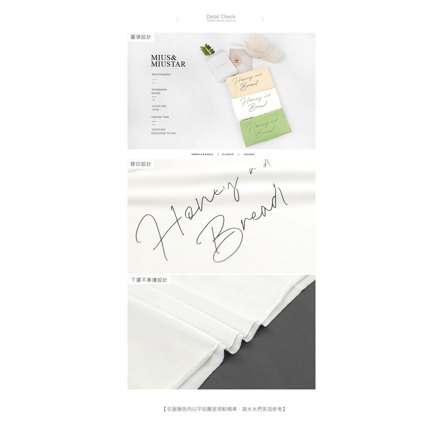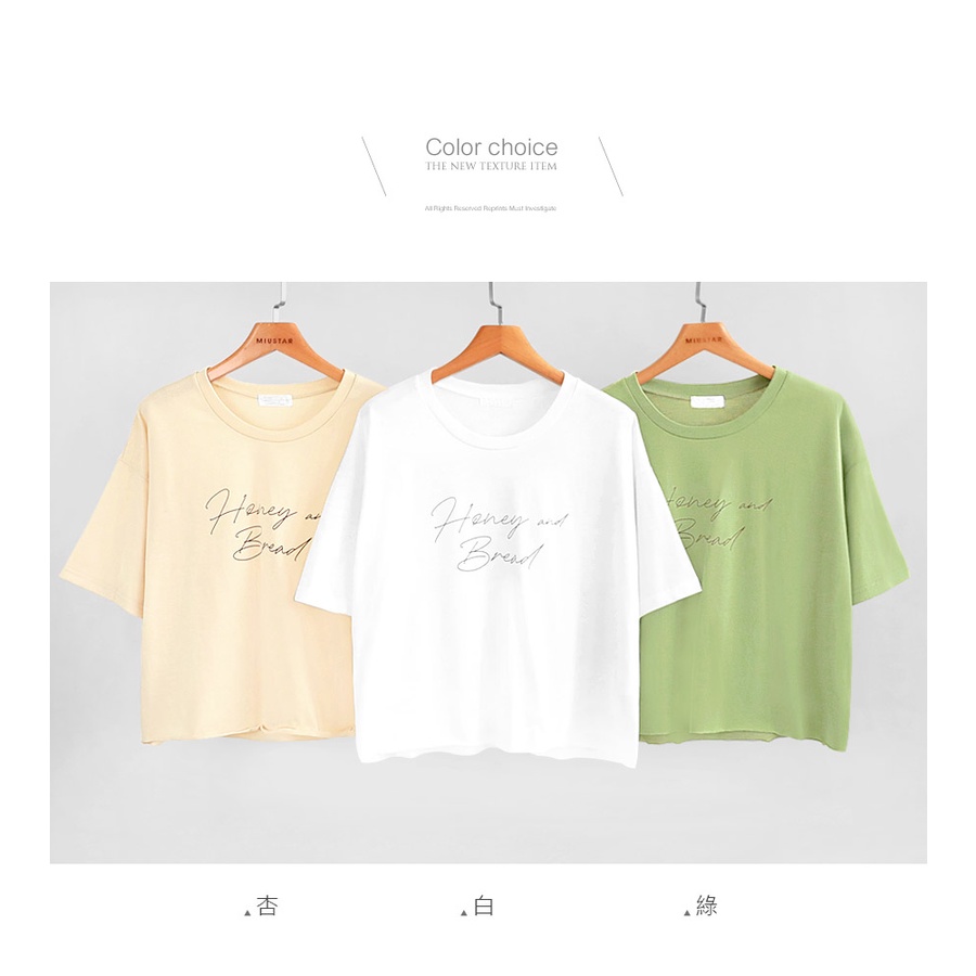 MIUSTAR 正韓-圓領草寫字下擺不車邊棉質上衣(共3色)0621 預購【NL1552RE】杏F|綠F|白FT-shirtsMIUSTAR