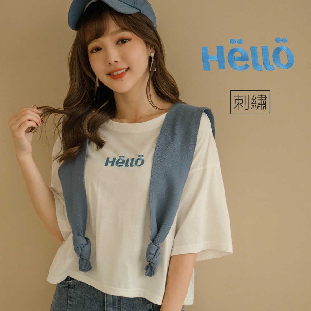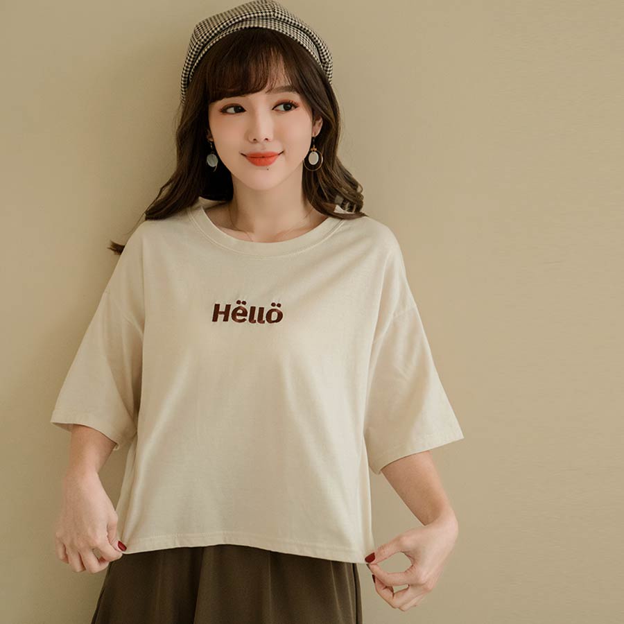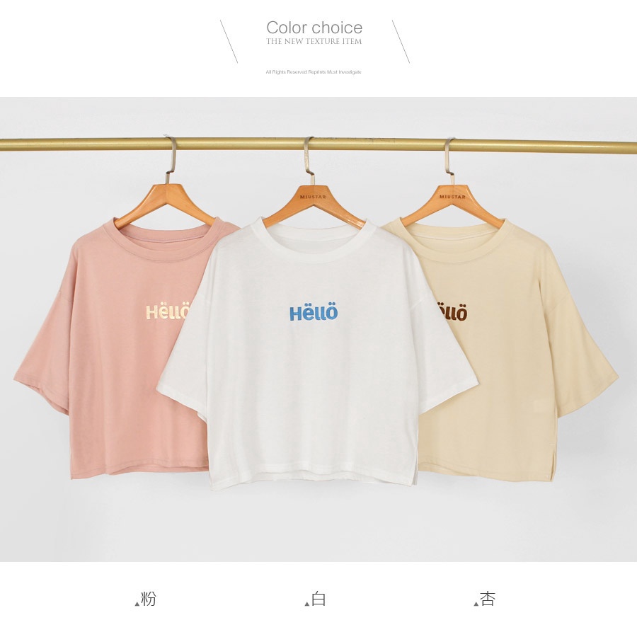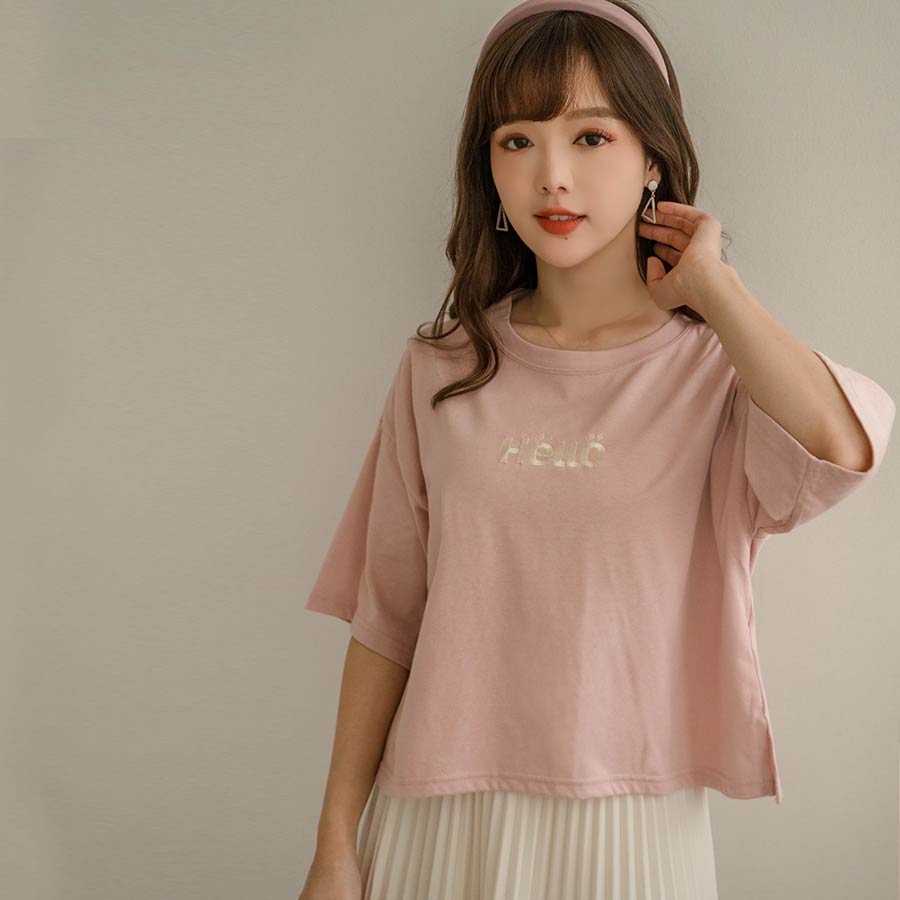 MIUSTAR 正韓.側開岔HELLO可愛刺繡寬版上衣(共3色)0227 預購【NL3464RE】白F|杏F|粉FT-shirtsMIUSTAR