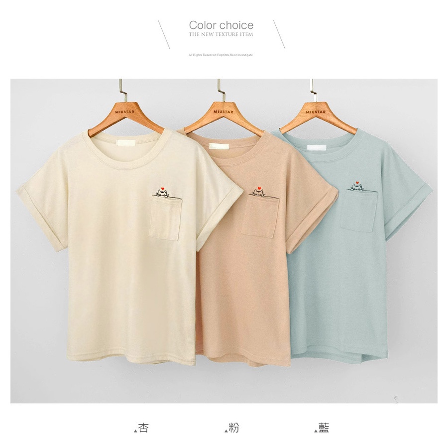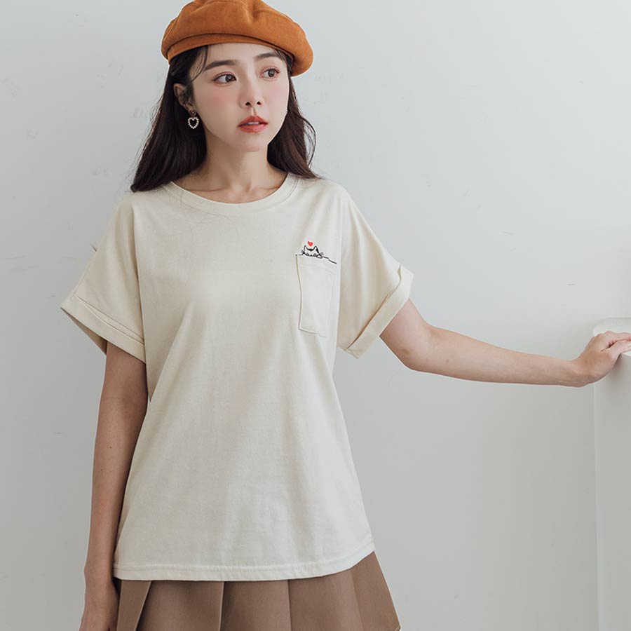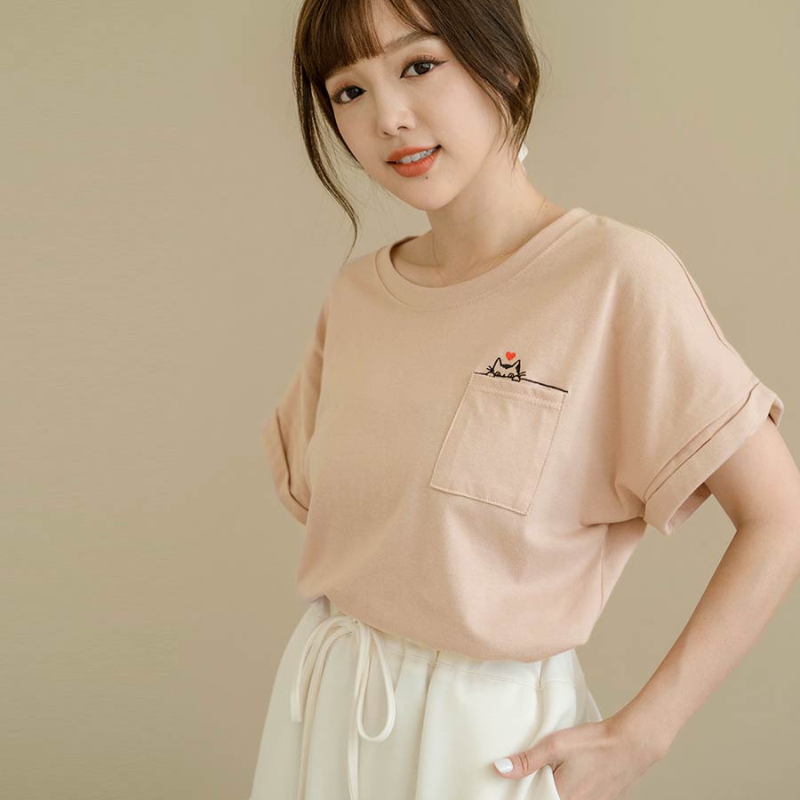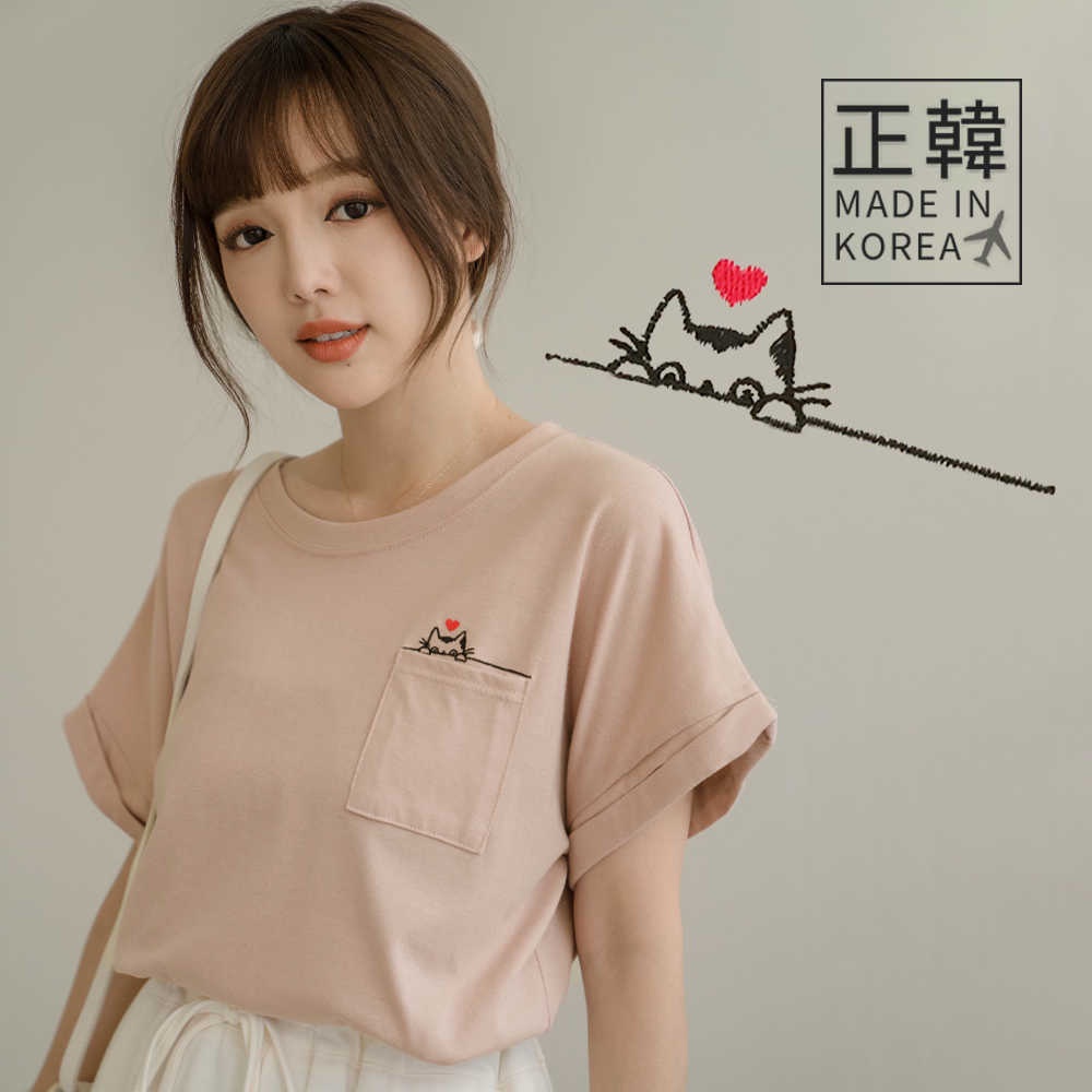 MIUSTAR 正韓.愛心躲貓貓口袋反摺袖棉質上衣(共3色)0627 預購【NL4587RE】粉F|藍F|杏FT-shirtsMIUSTAR