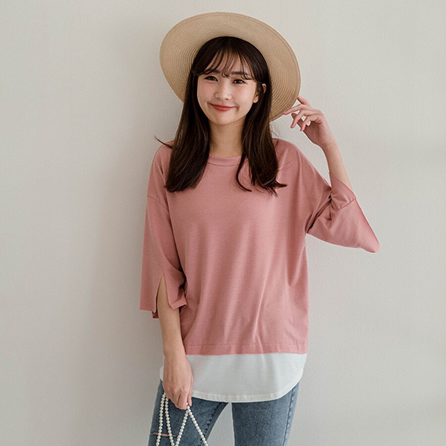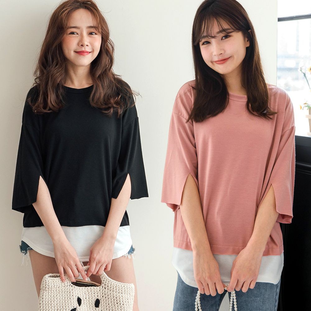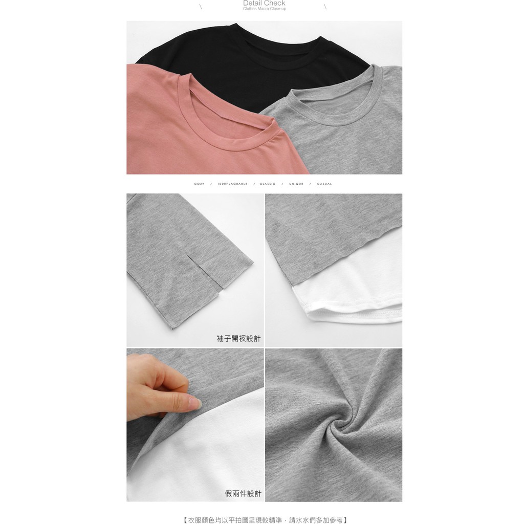 MIUSTAR 正韓 袖開衩假兩件圓弧下襬超彈棉質上衣(共3色)0221 預購【NJ0791RE】黑F|灰F|粉FT-shirtsMIUSTAR