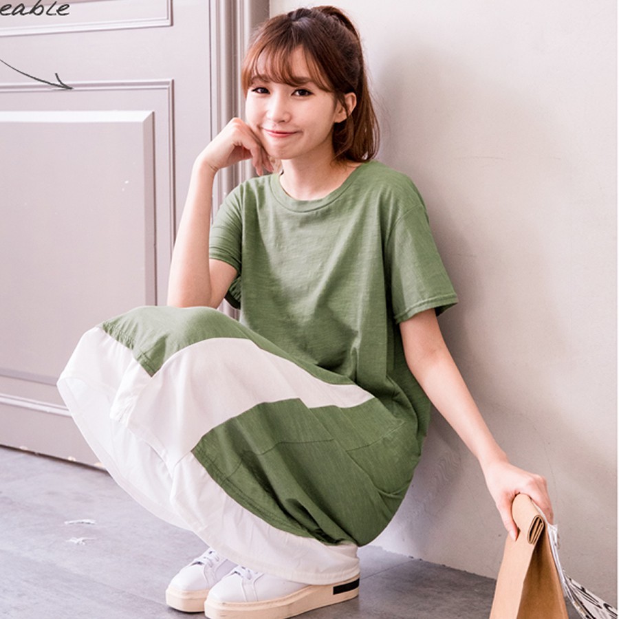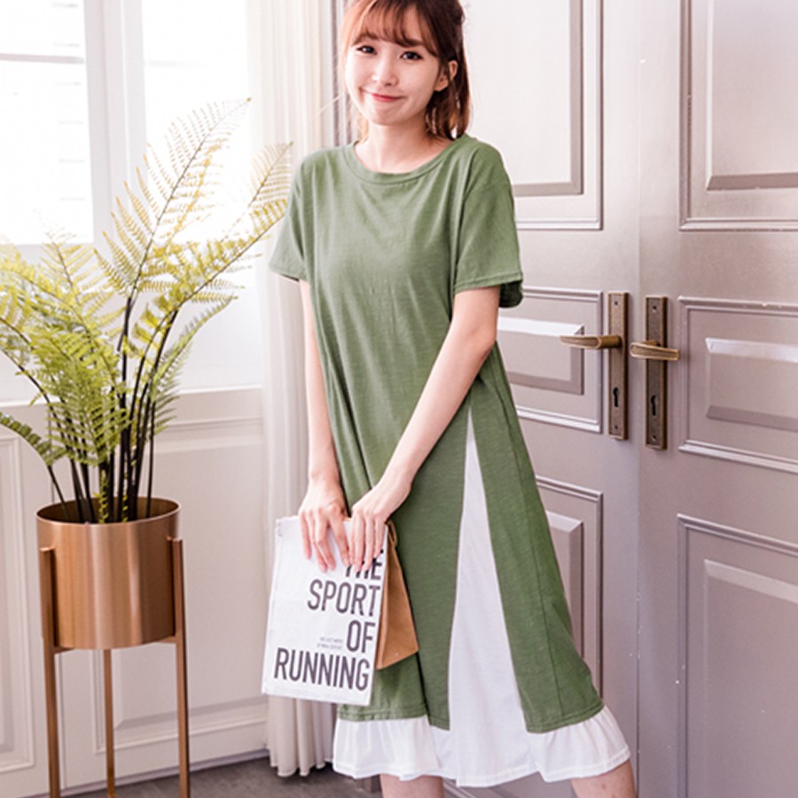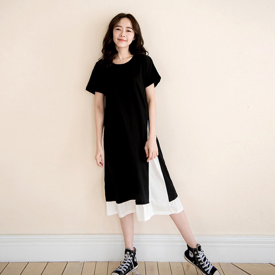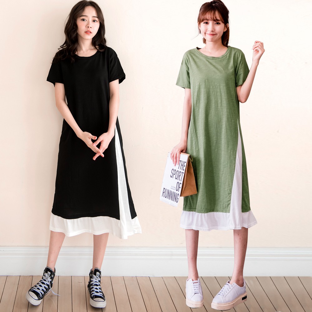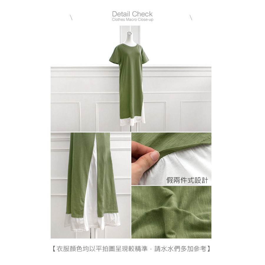 MIUSTAR 正韓 假兩件視覺顯瘦側剪接配色竹節棉洋裝(共2色)0503 預購【NL1424RE】黑F|綠FMIUSTAR