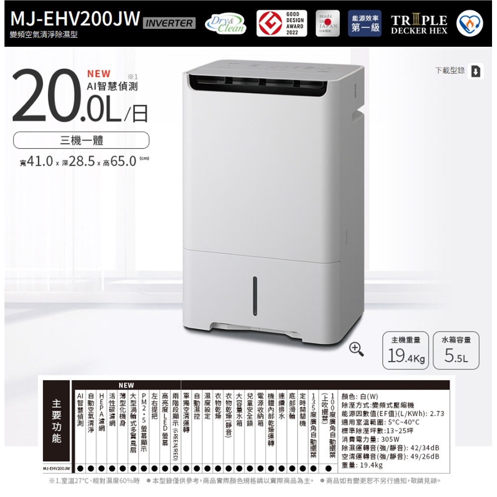 三菱 20公升 日本製 HEPA變頻空氣清淨除濕機 MJ-EHV200JWMJ-EHV200JW-TWAir TreatmentMITSUBISHI 家電館