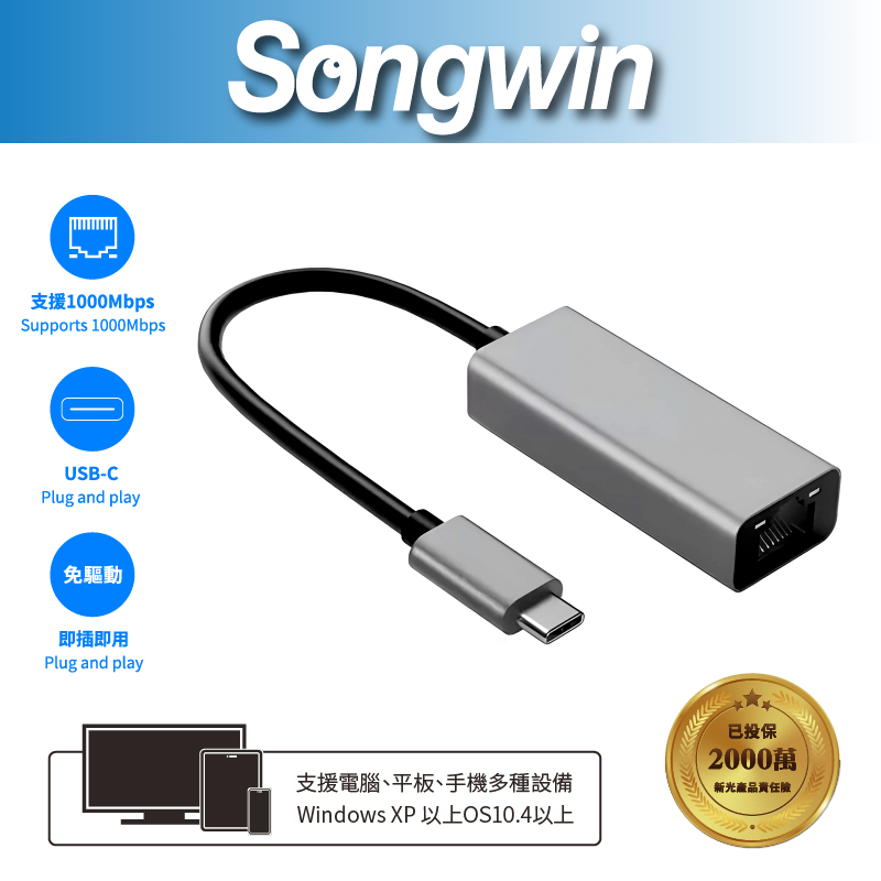 【Songwin】UEH360 USB-C TO RJ45千兆網路卡[尚之宇旗艦館][發票保固]【Songwin】UEH360 USB-C TO RJ45千兆網路卡[尚之宇旗艦館][發票保固]Network Switches & PoESONGWIN 旗艦館