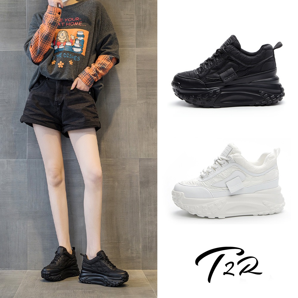 【T2R】正韓空運-編織鞋帶潮流熱門厚底老爹鞋-增高約8公分-黑/米-5985-2196/5985-2197